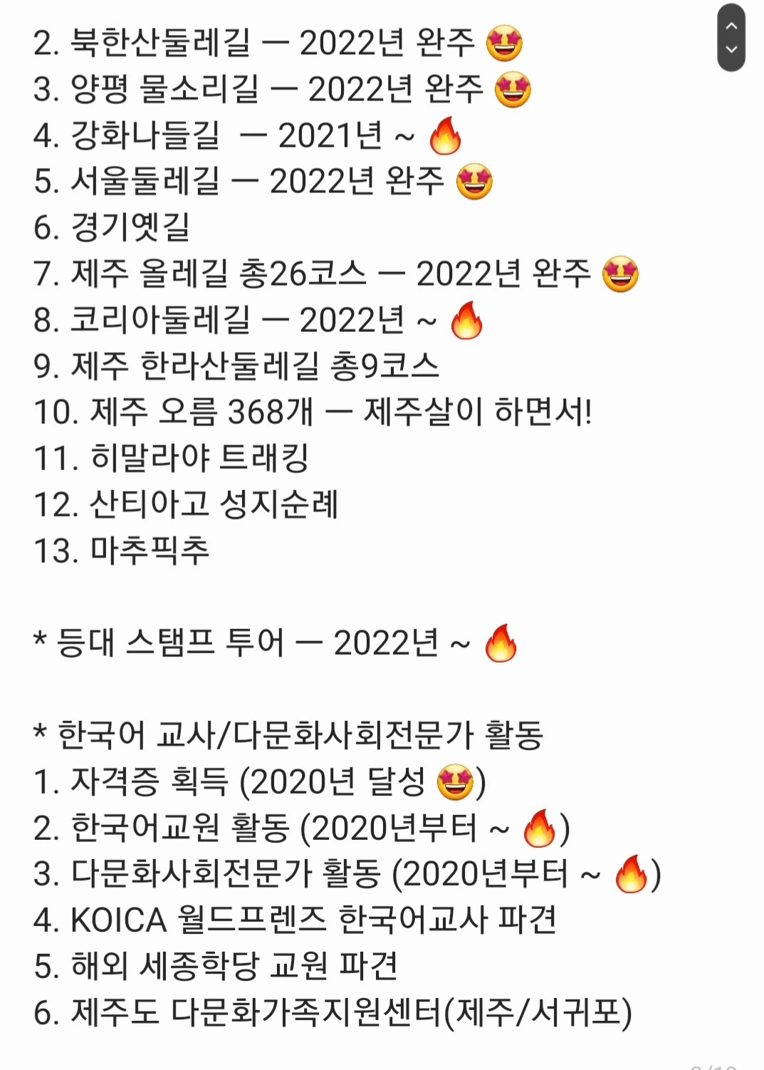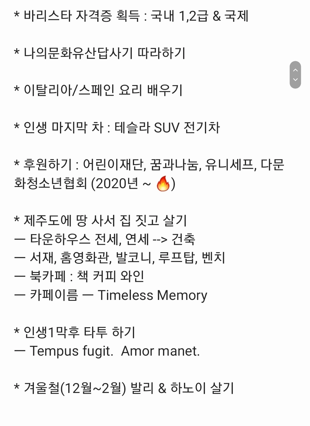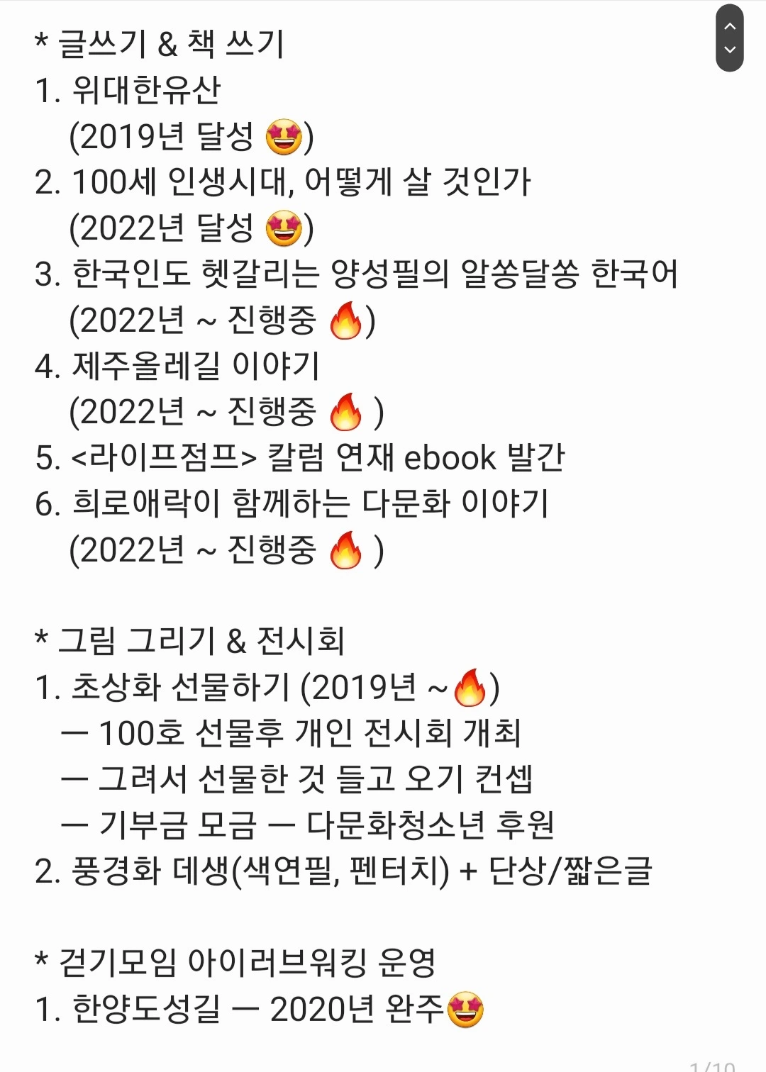 현재 내 버킷 리스트에는 책 쓰기, 100명의 지인에게 초상화 선물하기, 코리아 둘레길 완주하기, 산티아고 성지 순례하기, 해외에서 한국어 교사로 활동하기 등이 등재되어 있다.