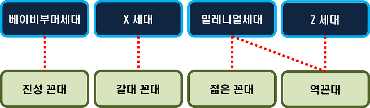 세 번째, 젊은 꼰대는 밀레니얼 세대다. 70년대생과 90년대생 사이에 끼어 있어서 '낀대"라고도 한다. 이들은 쿨(cool)한 꼰대형이다. 이들은 나름 신세대라 Z세대와 서로 잘 통할 것 같지만 의외로 서로 힘들어한다. 견제와 경쟁심리도 작용한다. 나이 든 꼰대보다 더 힘들다는 소리를 듣는 경우가 흔하다. 이들은 '일잘러'로서 우월의식을 가진, ‘나만큼 할 수 있어?’의 무시형 냉소파인 경우가 많다고 한다.
