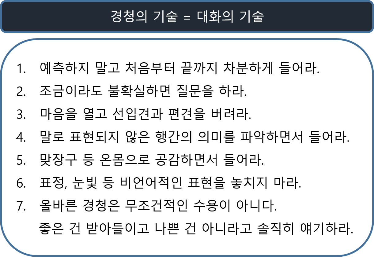 5. 글을 마무리하면서 나 스스로 아내와의 대화에서 늘 염두에 두고 노력하고 있는 딱 두 가지를 소개하겠다. 첫 번째, 아내와 대화를 할 때엔 지금 하고 있는 일을 완전히 멈추고, 몸의 방향을 아내 쪽으로 돌려서 얼굴을 마주 보고 대화한다. 그렇게만 하면 경청의 전제 조건을 최소한 90%는 갖춘 것이다. 경청은 진심으로 진심을 끌어내는 여정이다. 경청을 할 수 있으면 대화는 저절로 자연스러워진다.