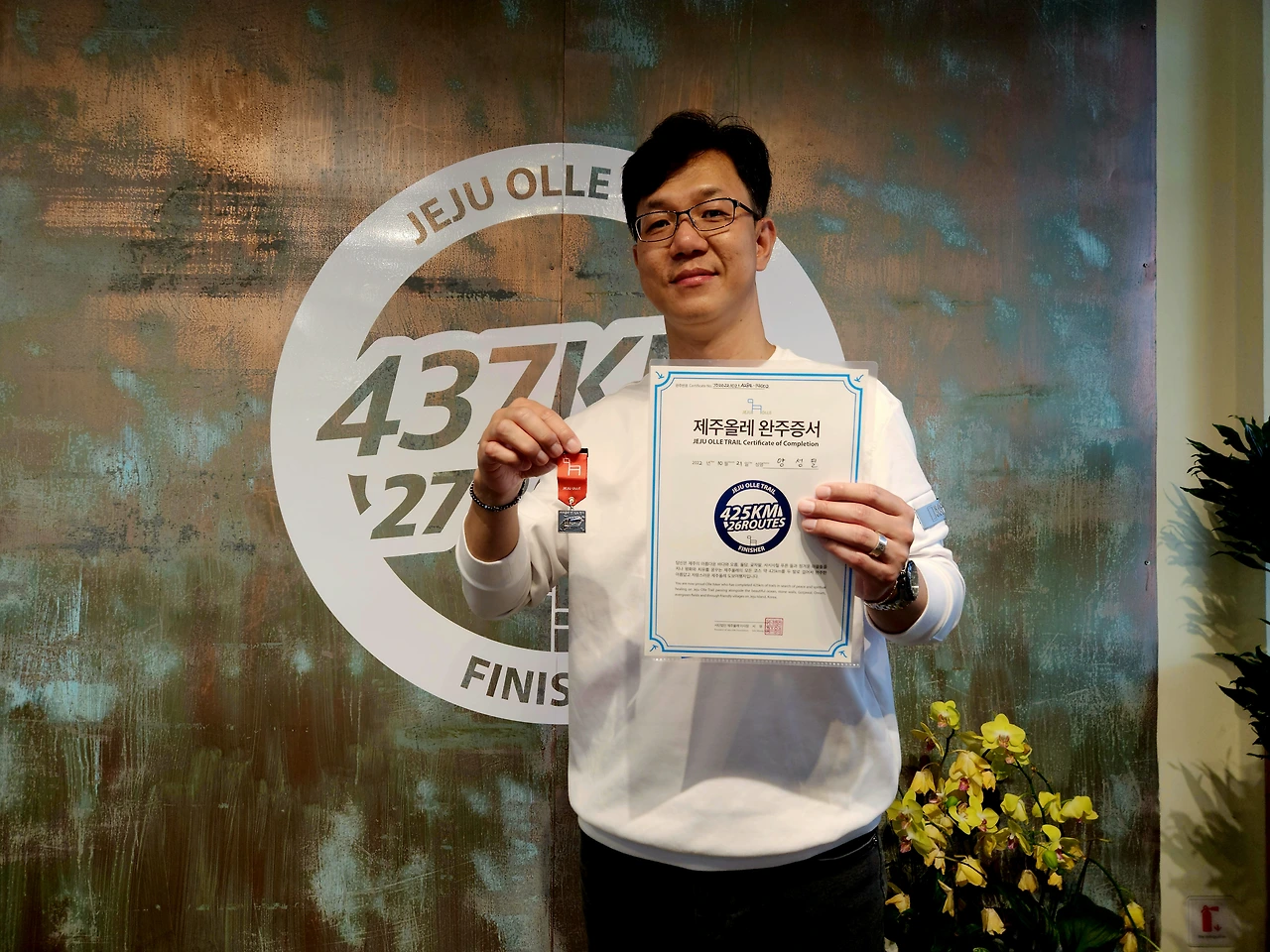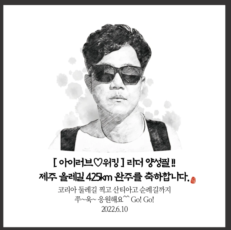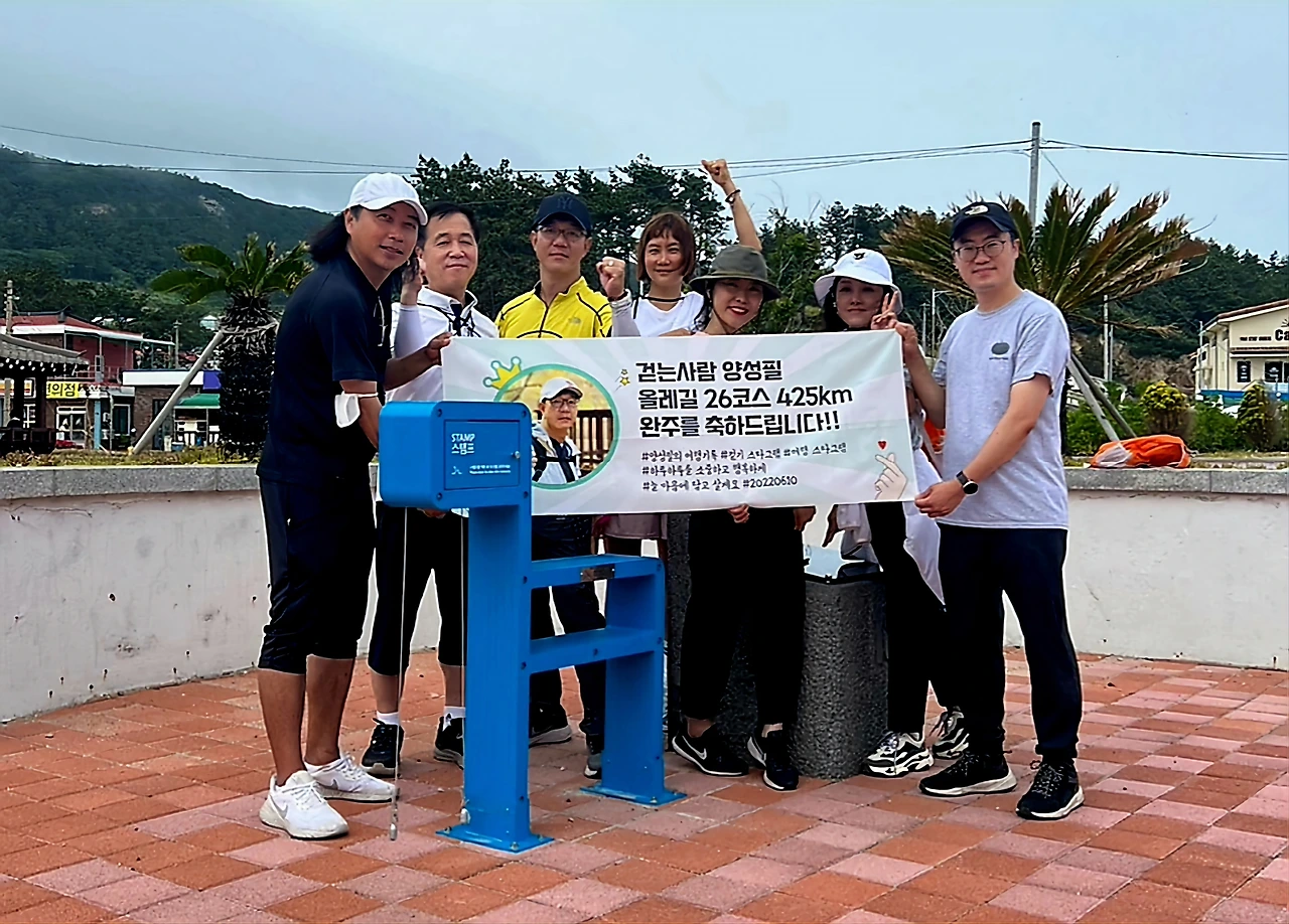 나는 2019년 11월 7일부터 2022년 6월 10일까지 2년 7개월에 걸쳐 서울과 제주를 오가며 걸었던 <제주 올레길> 총 26개 코스, 425km를 완주하고 마침표를 찍었다. 정말 감격스러운 날이었다. 특히 완주의 기쁨과 의미를 더해준 것은 마지막 코스인 추자도를 함께 걸어준 <아이러브워킹> 멤버들이었다. 기념 현수막과 액자까지 준비해서 선물해줬다. 평생 잊지 못할 소중한 추억이다. 나는 16,824번째 제주 올레길 완주자로 <올레길 명예의 전당>에 등재됐다. 나 스스로가 대견하다.