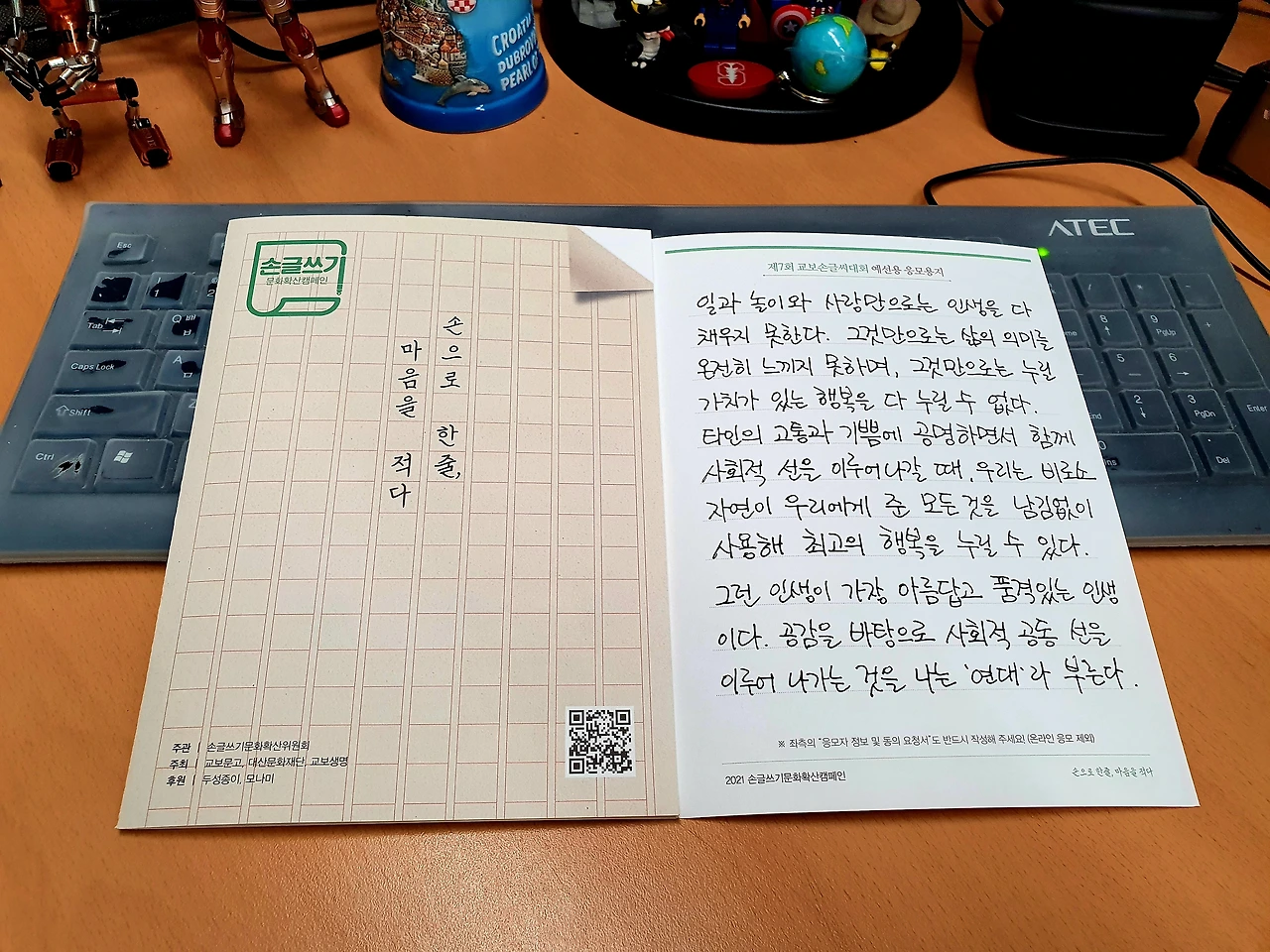 <교보문고 손글씨 쓰기>에 제출한 내 삶의 좌우명 놀고 일하고 사랑하고 연대하자