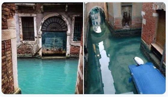< 코로나 19의 영향으로 관광객이 줄면서 맑아진 이탈리아 베네치아 운하의 물 (출처 : 트위터) >
