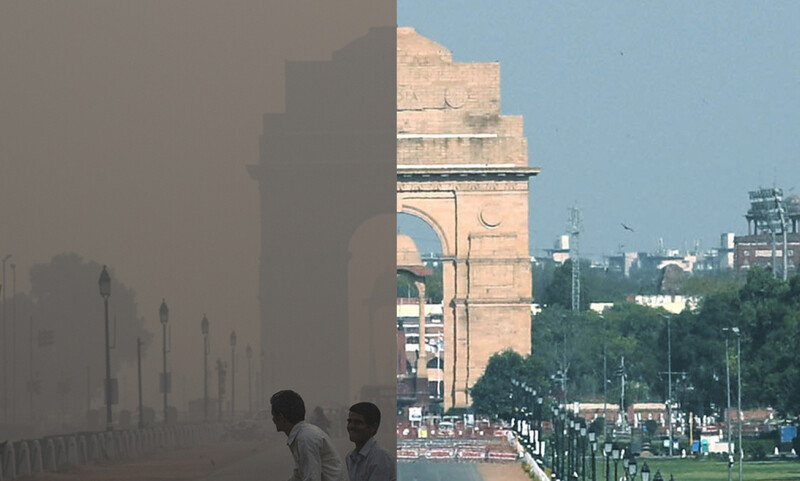 < 인도 수도 뉴델리의 하늘 : 국가 봉쇄령 이전(왼쪽)과 이후(오른쪽) (출처: 뉴델리/AP 신화 연합뉴스) >
