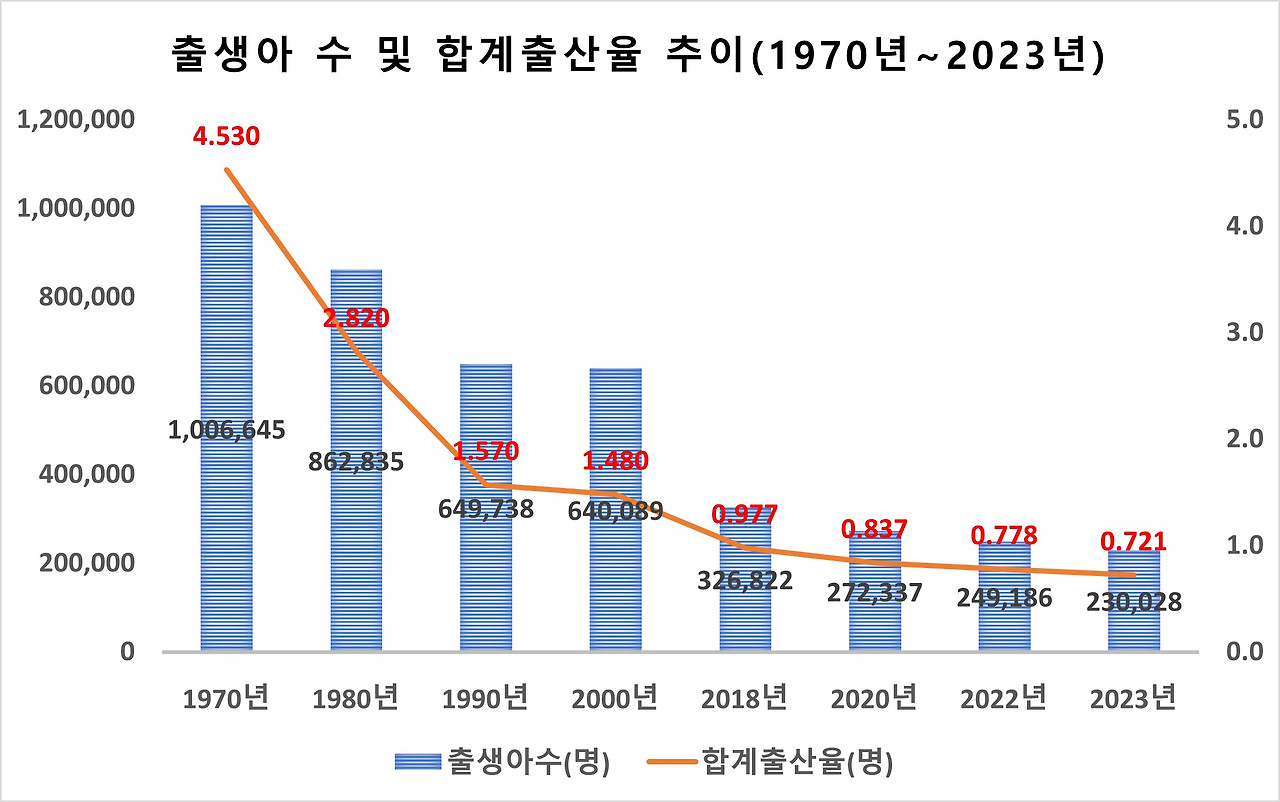 대한민국의 인구가 감소하고 있습니다. 1970년대까지만 해도 '아들 딸 구별 말고 둘만 낳아 잘 기르자'라는 표어를 우리 사회 곳곳에서 볼 수 있었습니다. 그런데 그때는 맞고 지금은 틀린 말이 되었습니다. 아래의 <그림 4-1>에서 볼 수 있듯이 50여 년 만에 출생아 수는 거의 1/5 수준, 합계 출산율은 1/6 수준으로 줄었습니다.