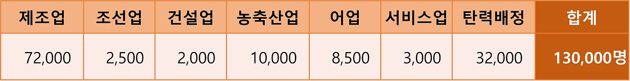 한편, 고용노동부는 매년 업종별로 외국인 근로자 도입 규모를 정하고 있습니다. 2025년 업종별 외국인 근로자 도입 인원은 아래의 <표 4-3>과 같습니다. 제조업이 7만 2천 명으로 가장 많고, 그다음으로 농축산업, 어업, 서비스업 순입니다.