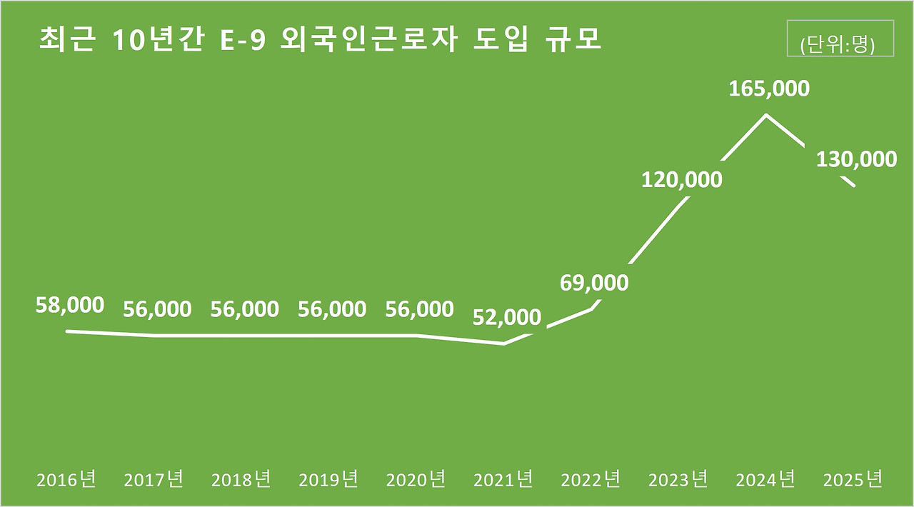 이때 외국인 근로자에게 발급하는 비자는 E-9(비전문 취업 비자)입니다. 'E-9'은 외국인 근로자가 제조업, 농업, 건설업, 서비스업 등 한국의 특정 산업에서 비전문직으로 근무할 수 있도록 허용하는 비자입니다. 최근 10년 간 E-9 외국인근로자 도입 규모는 <그림 4-2>와 같습니다. 2025년에는 비전문취업 외국인 근로자 도입 규모가 13만 명에 달합니다.