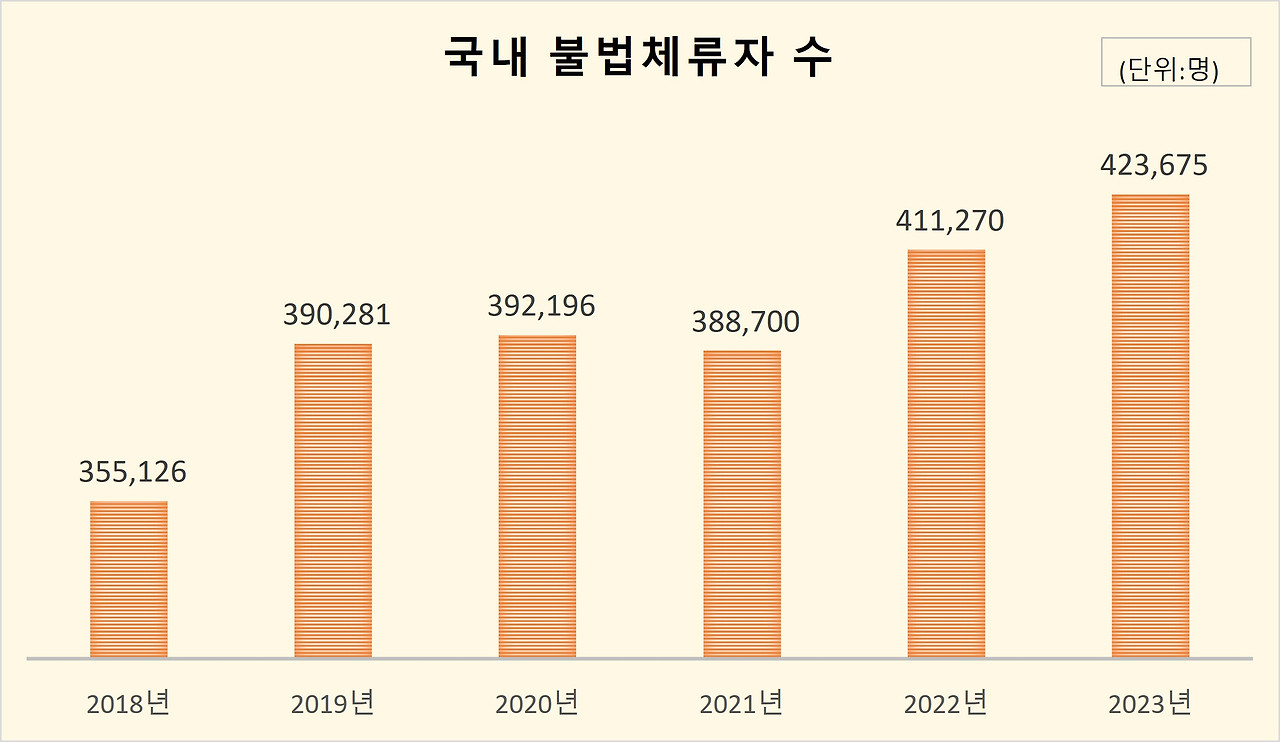 <그림 5-1>을 보면, 2023년을 기준으로 국내 불법체류자의 수는 42만 명을 넘어섭니다. 불법체류자는 법적인 제도를 지키지 않았기 때문에 호칭 앞에 '불법'이란 수식어가 붙습니다. 우리가 이들 불법체류자를 과연 '범죄자'로 부를 수 있을까요? 고용허가제의 모순적인 부분이 불법체류를 조장하고 있지는 않을까요?