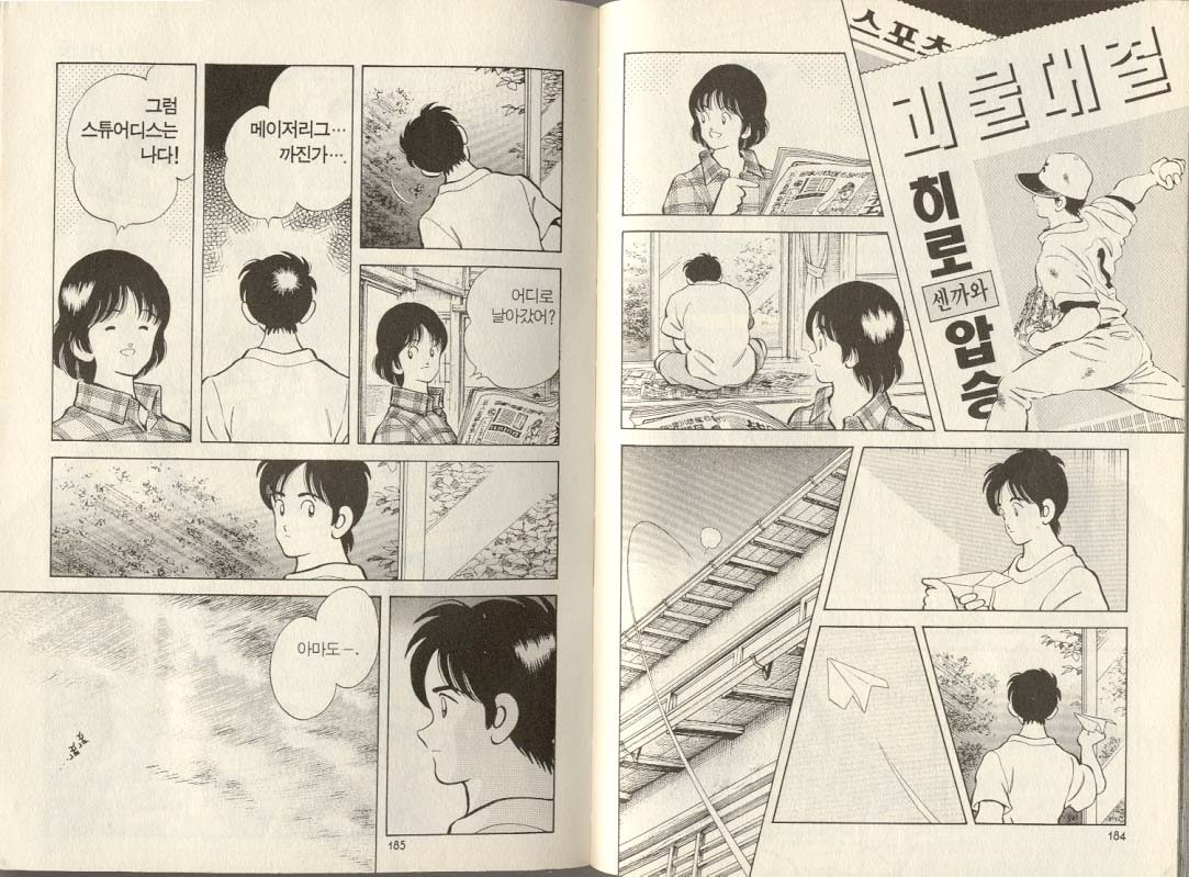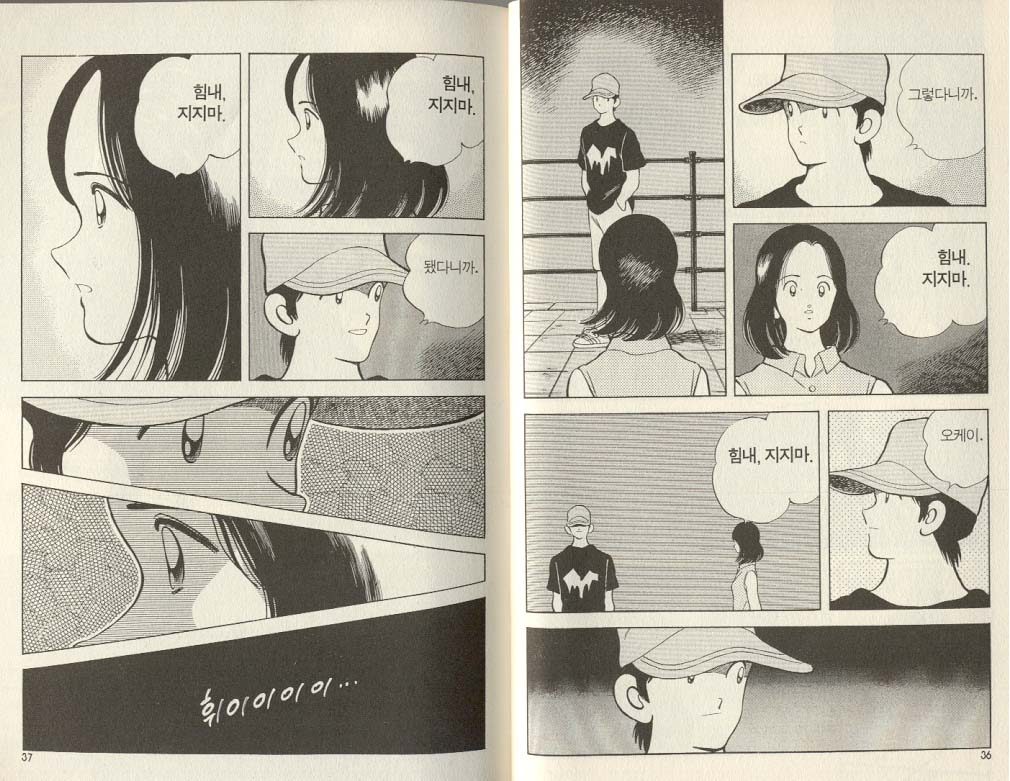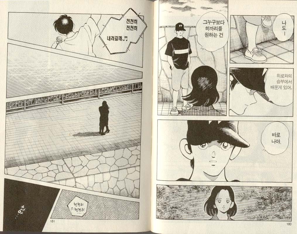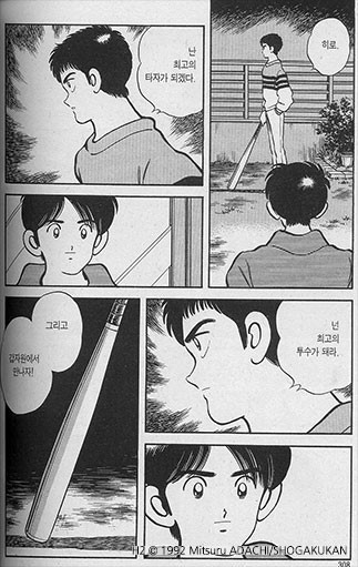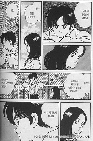 <공포의 외인구단>과 <H2>는 필자의 인생만화다. 두 작품 다 소장본을 가지고 있고, 지금도 가끔씩 꺼내 보곤 한다. 두 작품 모두 기본적으론 야구만화이지만, 남녀 주인공들의 사랑과 우정과 대결이 스토리 전개의 축이자 바퀴다. 두 작품 모두 서로 사랑이 이뤄지길 간절히 바라는 상대와 맺어지지 못한다. 독자를 아프게 만드는 스토리다. <공포의 외인구단>에서 오혜성이 엄지를 향한 지독한 사랑을 보여줬다면, <H2>에서 히로는 사랑하는 히까리를 곁에서 묵묵히 지켜보며, 말로는 표현하지 않는 가슴 아픈 사랑을 보여준다. 그래서 더 가슴 아프고, 필자로 하여금 히데오보다 히로를 응원하게 만든다.