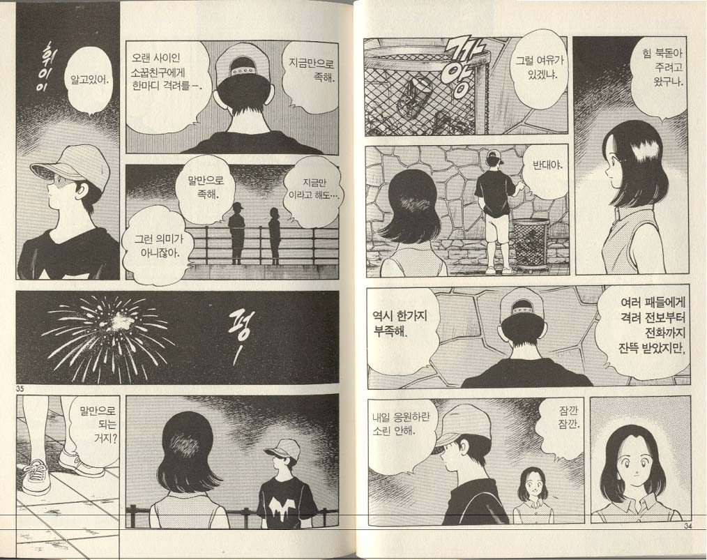 느슨하게 쉽게 쉽게 그리는 그림 같지만, 깨알 같은 작가의 유머, 재치, 감동이 주인공들의 대화 속에, 그리고 페이지 장면마다에 깊숙이 녹아들어 있다. 풍부한 감성이 담긴, 짧지만 여운이 긴 주인공들의 대사, 과감한 대사 생략, 주인공 표정의 클로즈업, 예고편 고지와 같은 작가 자신의 때아닌 등장 등 작가 ‘아다치 미츠루’의 연출력은 실로 어마어마하다. 소꿉친구, 첫사랑, 우정, 절친, 삼각관계, 정면대결이라는 소재를 바탕으로 때론 애잔하게, 때론 운치 있게, 때론 가슴 뭉클하게 채워진 페이지는 이 작품을 읽는 처음부터 끝까지 시선과 마음을 사로잡는다.
