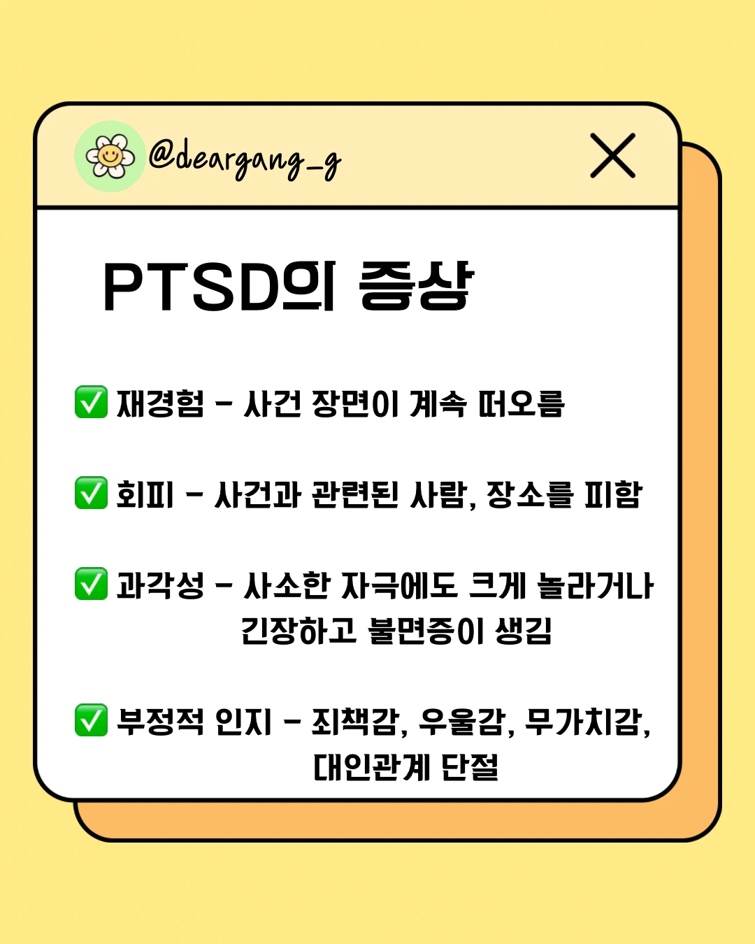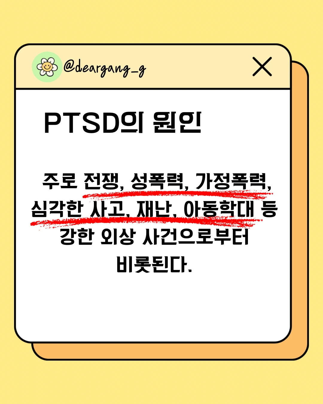 전쟁, 성폭력, 가정폭력, 심각한 사고, 재난, 아동 학대처럼 생명을 위협하거나 극심한 공포를 경험한 뒤 나타나는 심리적 장애입니다.