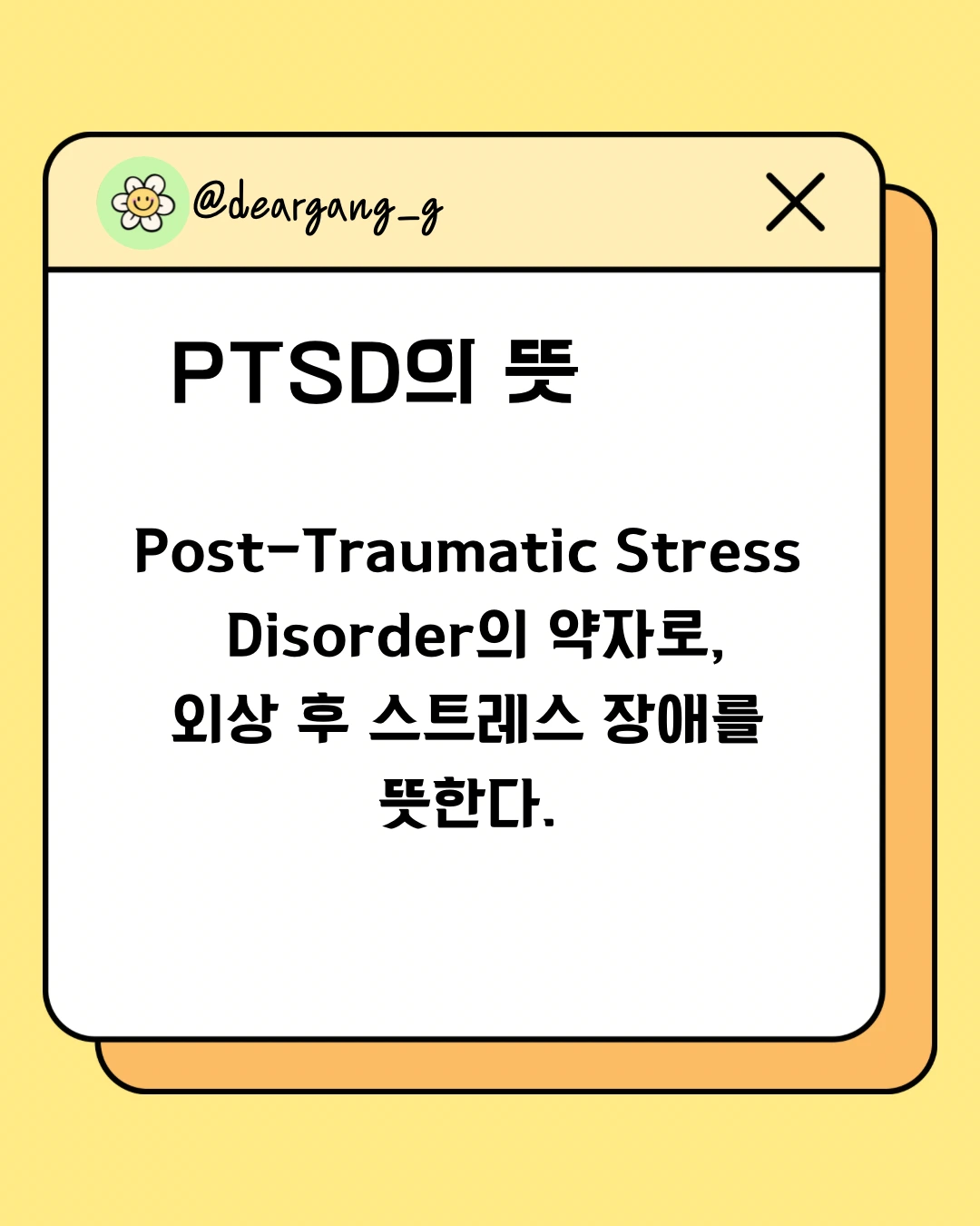 PTSD는 Post-Traumatic Stress Disorder, ‘외상 후 스트레스 장애’를 뜻합니다.