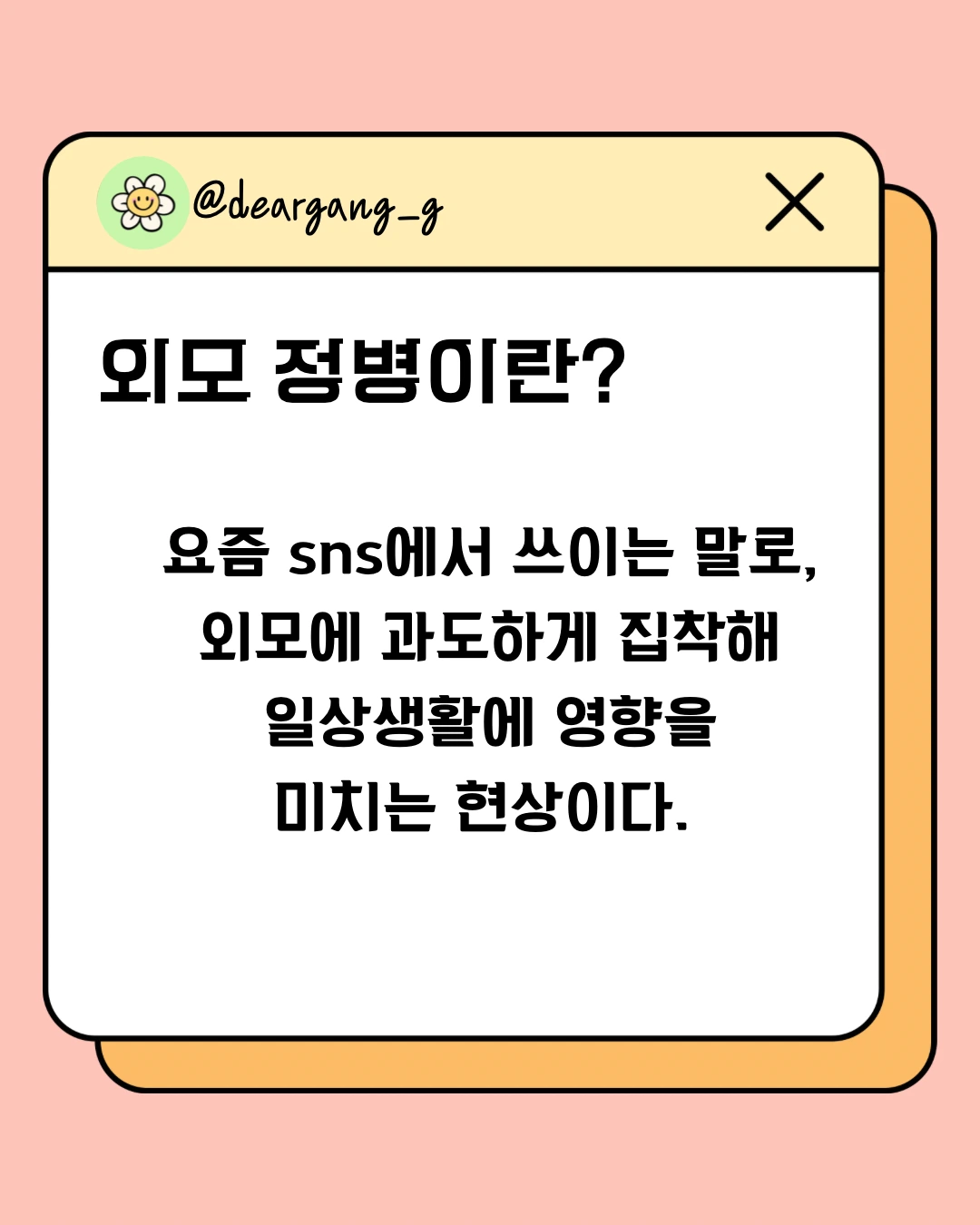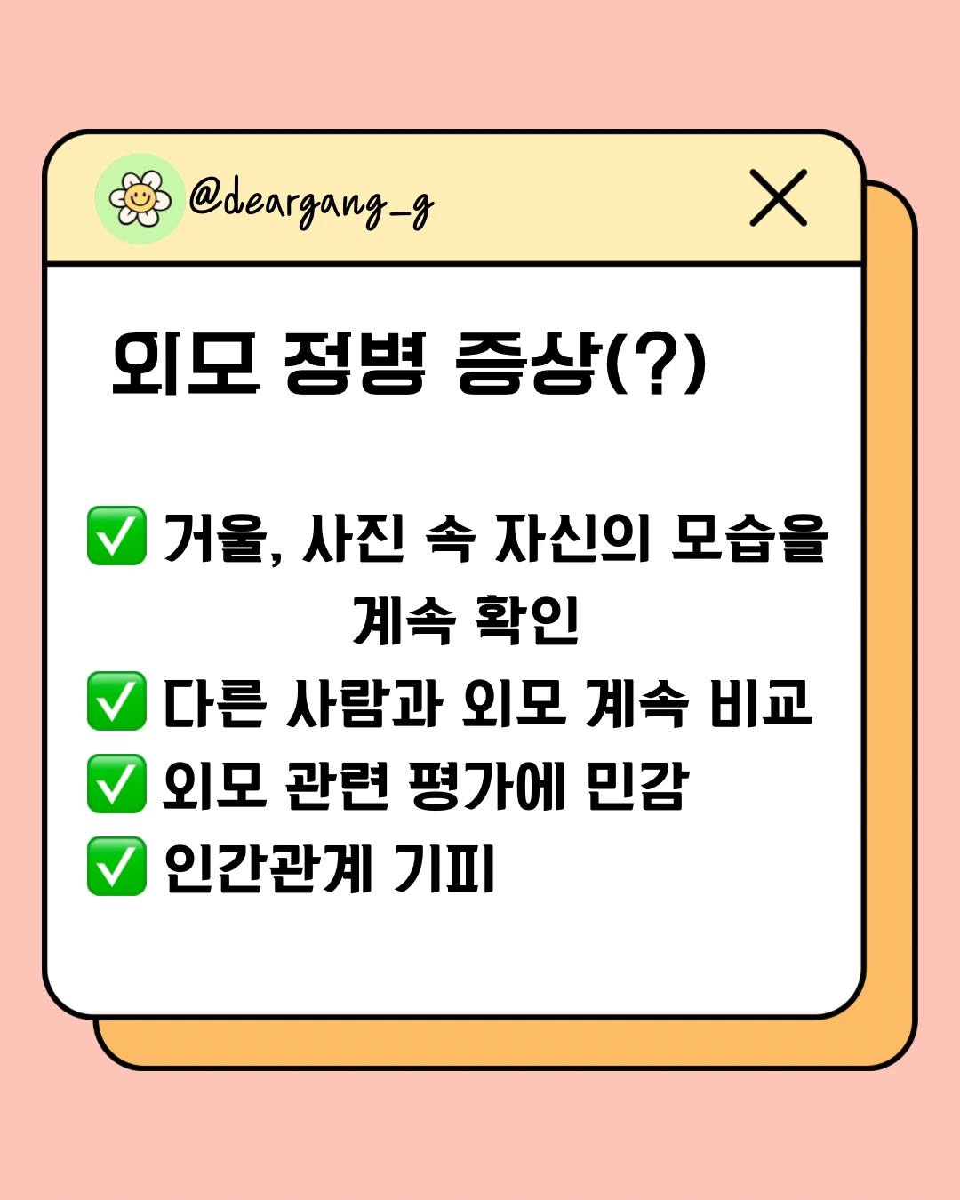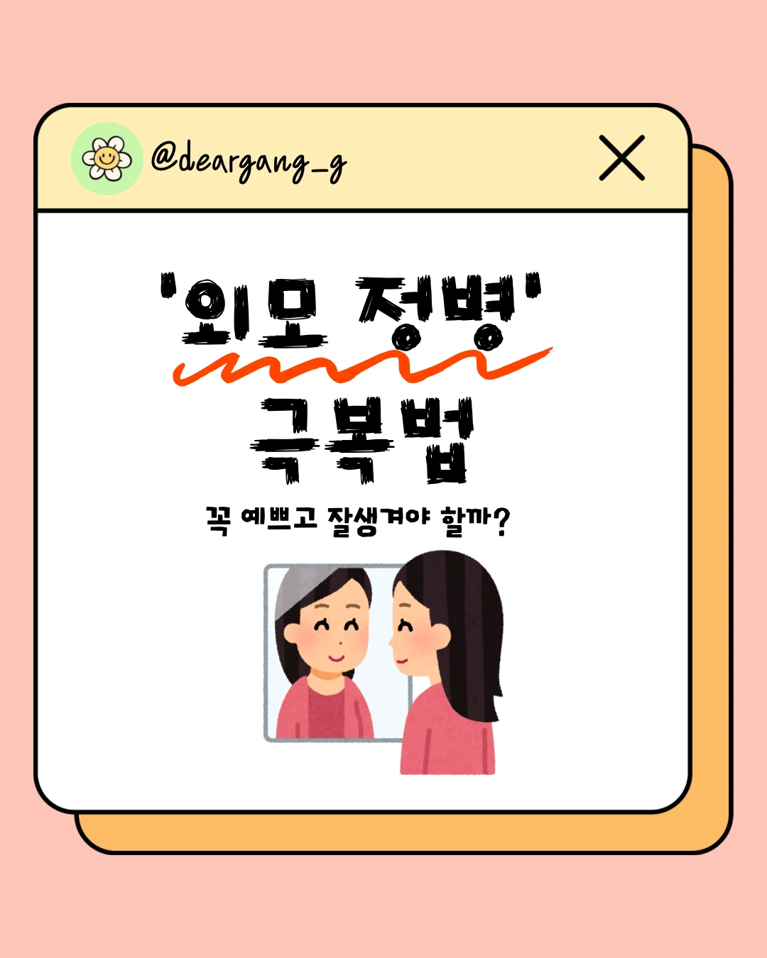 최근 SNS에서 자주 보이는 말 중 하나가 ‘외모 정병’입니다. 외모에 과도하게 집착해 일상에 영향을 미치는 현상을 가리키죠. 거울을 자주 들여다보고, 사진 속 내 얼굴을 확인하며, 다른 사람과 외모를 비교하고, 외모에 관한 평가에 예민해지는 것. 이런 모습이 반복되면, 관계에도 피로가 쌓이기 마련입니다.