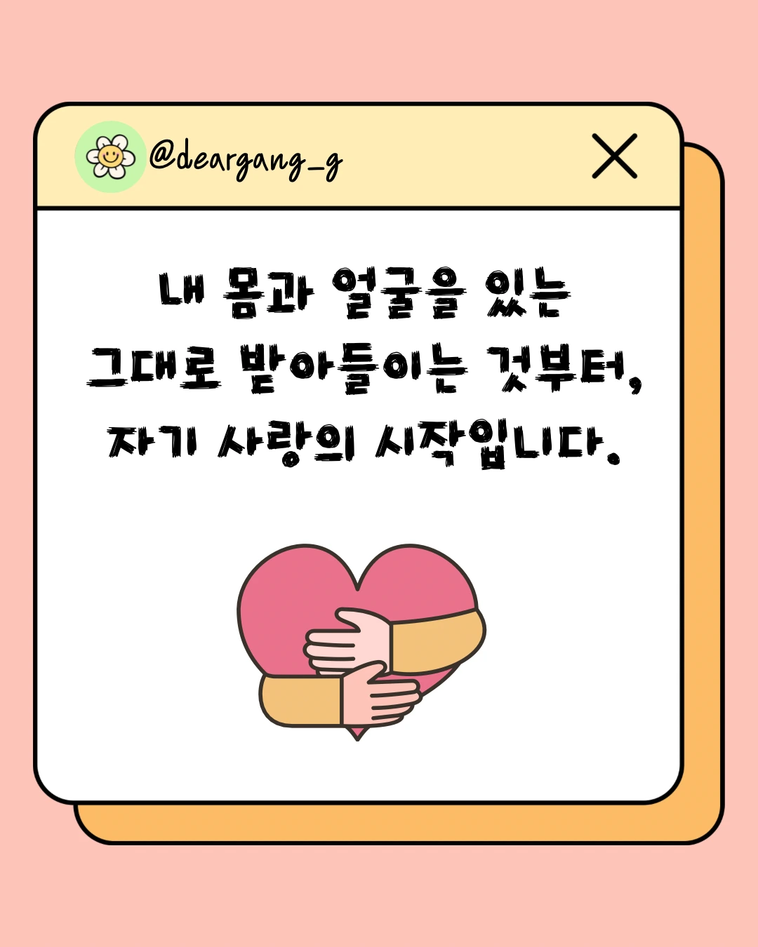 자기 사랑의 시작은, 내 몸과 얼굴을 있는 그대로 받아들이는 것에서 출발합니다. 타인의 시선 속 ‘완벽한 나’가 아니라, 나의 일상 속에서 편안히 숨 쉬는 나를 마주하는 것. 그 순간부터 우리는 조금씩 자유로워집니다.