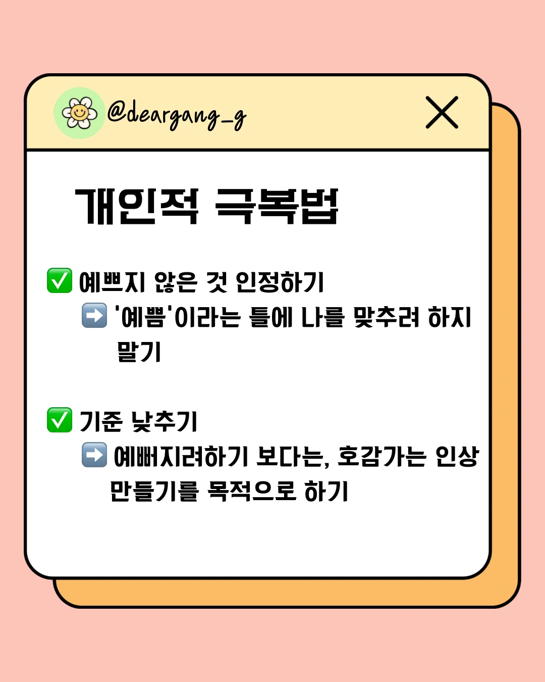 ‘예쁨’이라는 기준에 나를 맞추려 애쓰기보다, 있는 그대로의 나를 받아들이는 연습을 해보세요.
