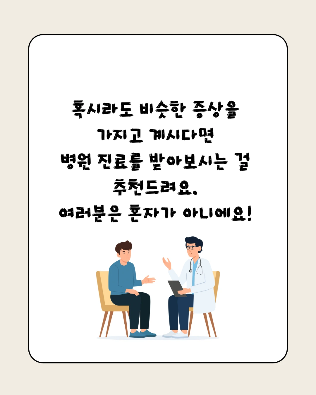 혹시라도 이 글을 읽으며 ‘나도 비슷하다’고 느끼셨다면, 병원 상담을 권해드리고 싶습니다. 전문가의 도움은 생각보다 훨씬 큰 변화를 만들어 줍니다.