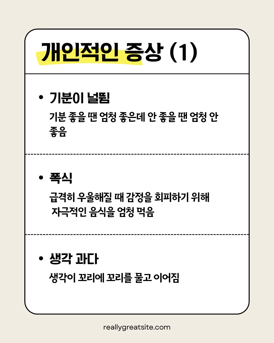 감정의 기복은 ‘의지 부족’이 아니라, 치료와 관리가 필요한 상태일 수 있습니다. 기억하세요, 여러분은 혼자가 아닙니다.