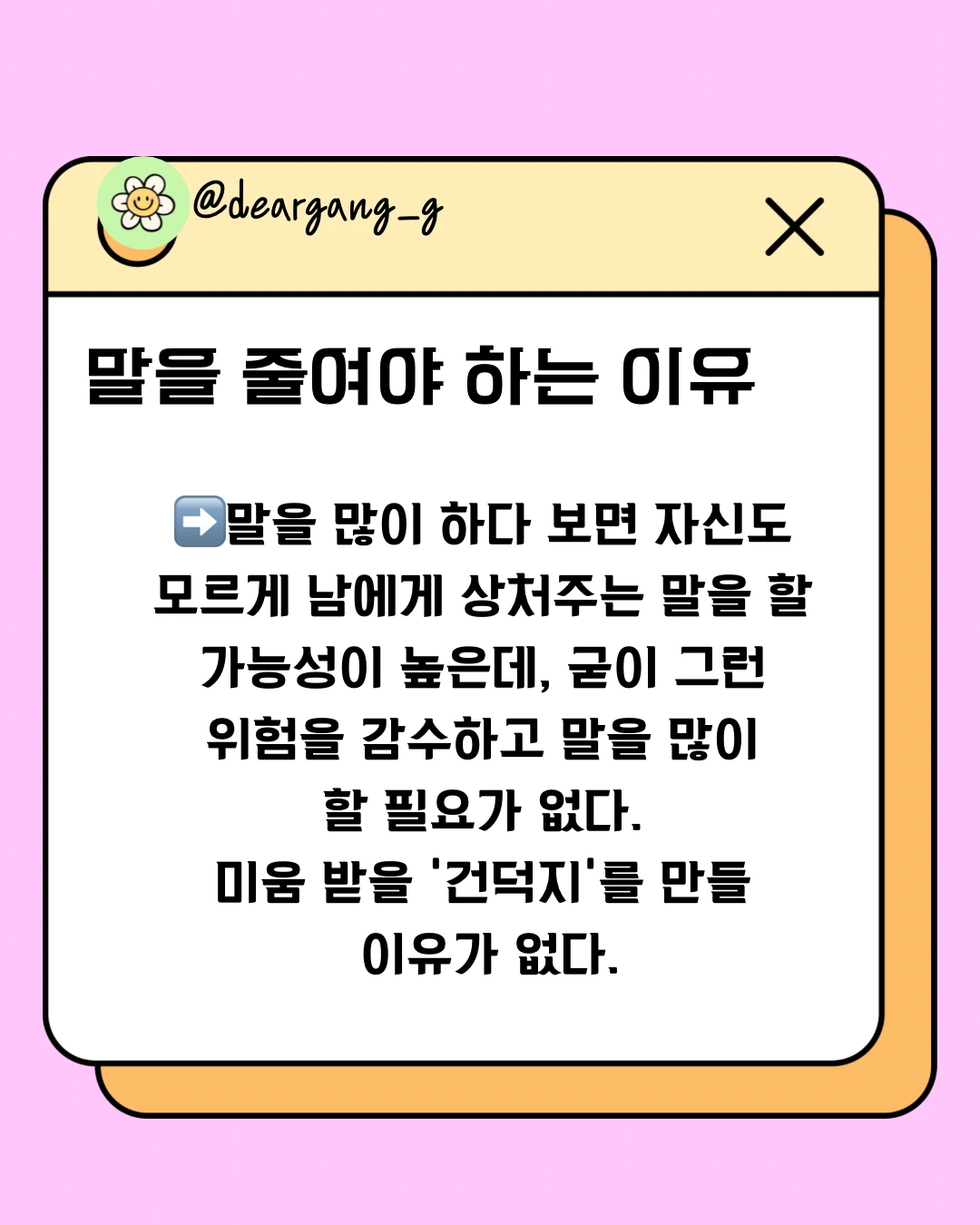 말을 줄인다는 것은 단순히 침묵한다는 뜻이 아닙니다. 불필요하게 감정을 자극하거나, 오해를 살 수 있는 ‘건덕지’를 만들지 않는다는 의미입니다. 우리가 꼭 하지 않아도 될 말을 줄이는 것만으로도 많은 갈등을 예방할 수 있습니다. 듣는 이에게 불필요한 상처를 남기지 않고, 나 자신도 괜히 후회할 일을 줄일 수 있는 방법이지요.