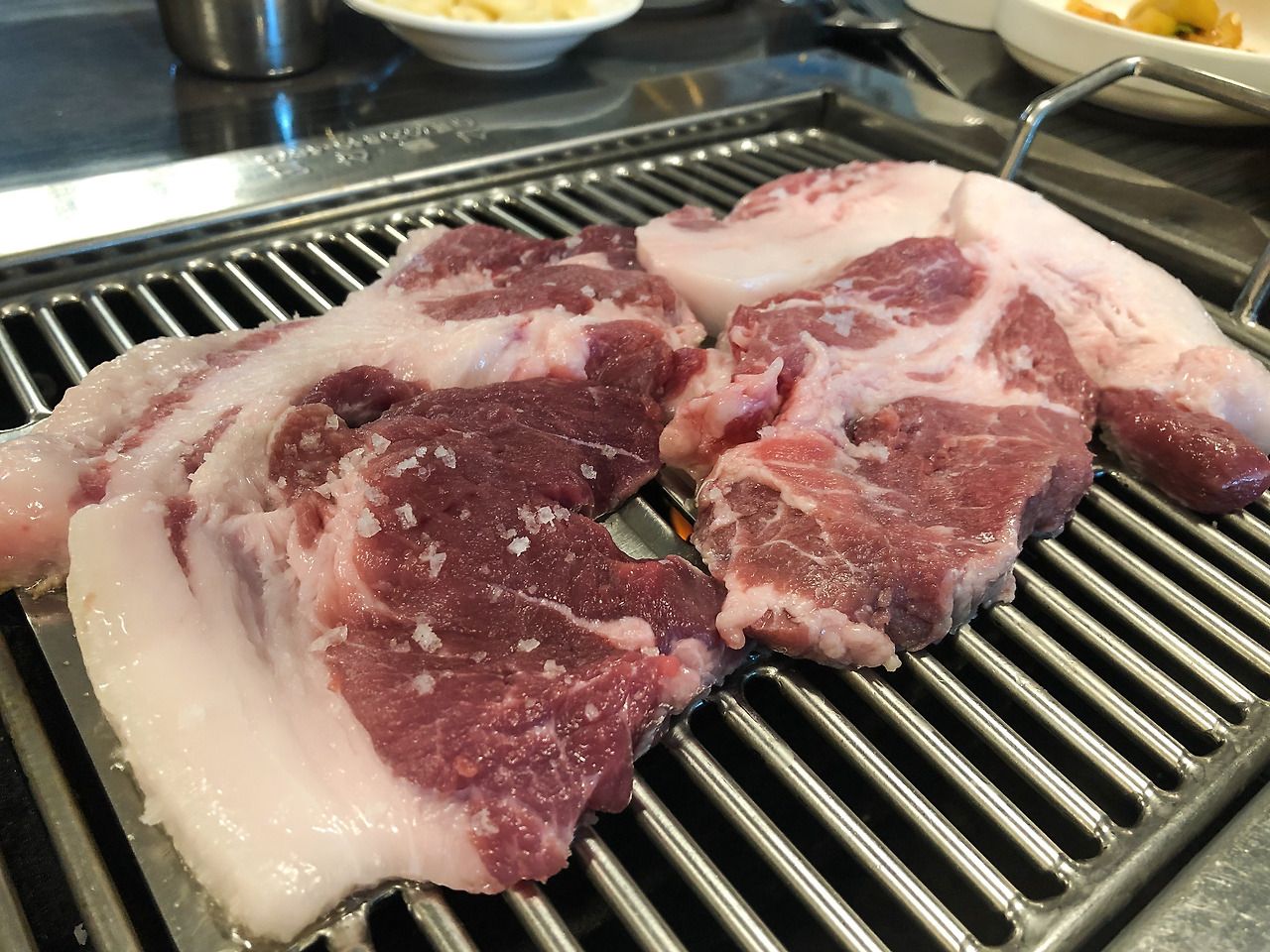 많은 지방 때문인지 고기를 굽기 시작하면 역시나 기름이 상당히 많이 빠져나온다. 소금 결정이 잘 보이는 걸로 봐선 내어주기 바로 직전에 뿌린 걸로 보이는데 고기의 맛에 예민하다면 주문 시 소금을 빼 달라고 미리 이야기를 하는 것이 좋겠다. 소금의 삼투압 현상으로 굽기 전 바로 뿌린 소금은 육즙을 빠져나오게 해 그 상태로 구우면 고기가 마를 수 있다고 한다. 어쨌든 워낙 고기가 좋아서인지 살은 물론 지방에서도 기분 나쁜 돼지 냄새가 나지 않는다. 지방마저 고소한 이 흑돼지는 평소 지방을 싫어하는 사람도 충분히 즐길 수 있을 만한 맛이다.