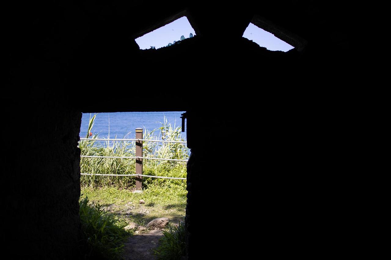 제주도 많은 오름, 특히 해안가에 있는 오름은 아픈 상처를 안고 있다. 2차 대전 당시 일본군이 만든 군사시설은 제주도 전역에 120여 곳에 이른다. 수월봉 해안에도 갱도진지가 남아 있는데 안에서 밖을 바라보는 풍경이 엉알길을 걸어오면서 감상하던 세계지질공원의 풍경과는 다른 느낌을 주기도 한다.