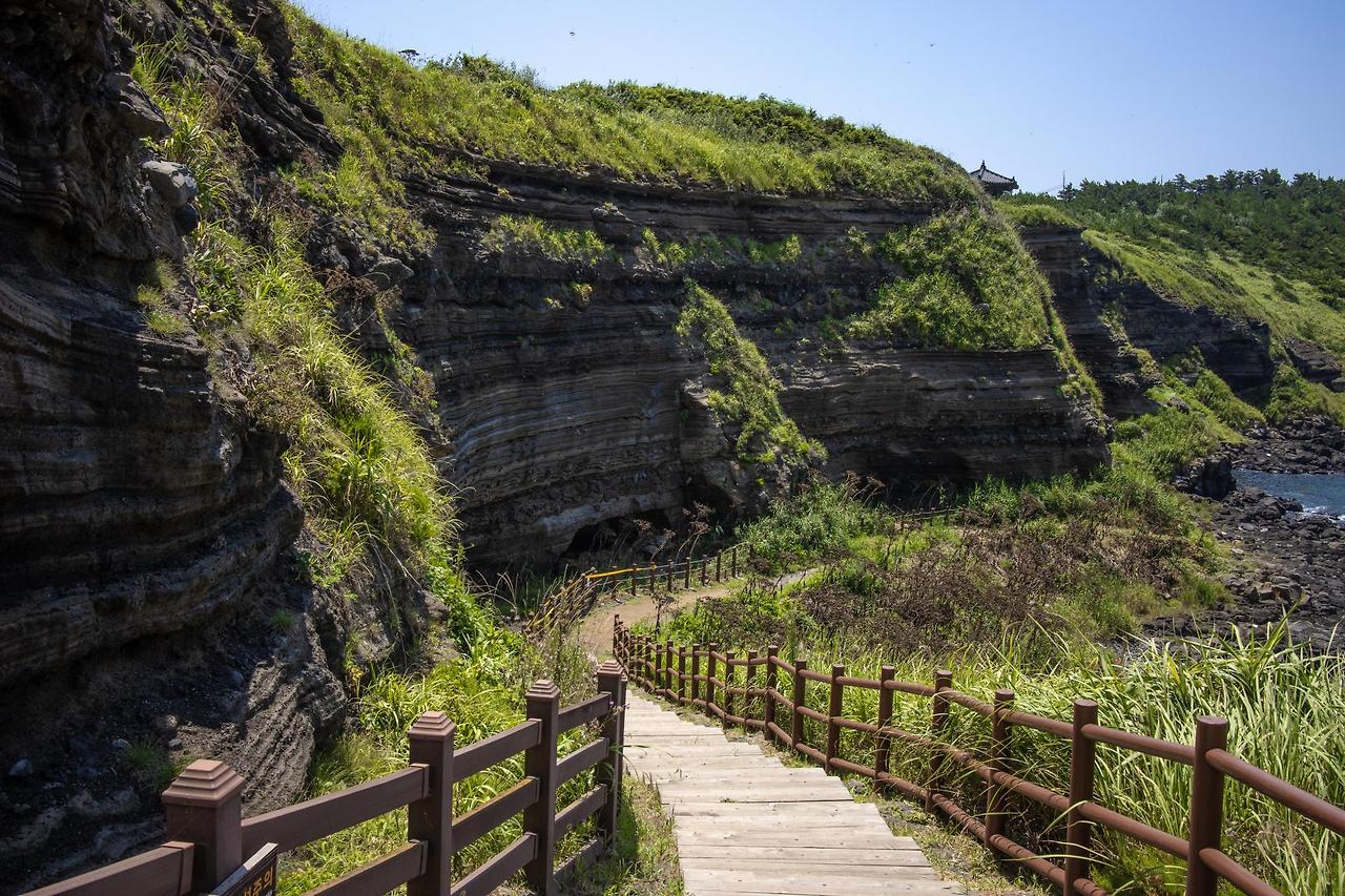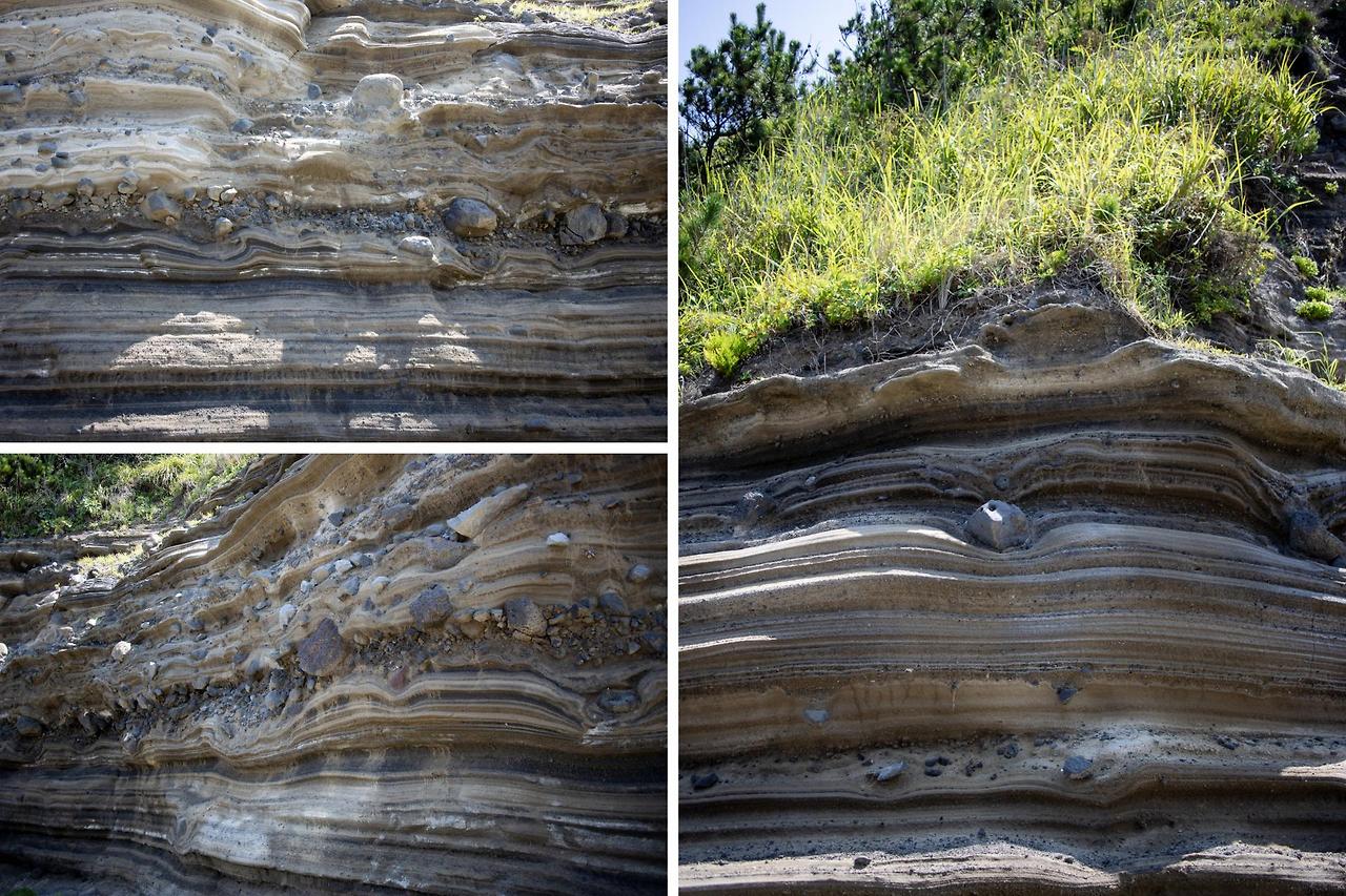 수월봉의 화산 지형은 수월봉 지질 트레일 A코스에서 정확히 확인할 수 있다. 이곳은 제주어로 ‘높은 절벽 아래 바닷가’라는 뜻의 ‘엉알길’로 불린다. 해안 길 따라 드러난 절벽에는 화산 활동으로 생겨난 독특한 모양의 퇴적층이 선명하게 보인다. 이 신비로운 풍경은 화산이 폭발할 때 함께 분출한 다양한 화산쇄설물이 쌓여 퇴적층과 탄낭구조*, 화쇄난류**와 같은 화산 지형이다.