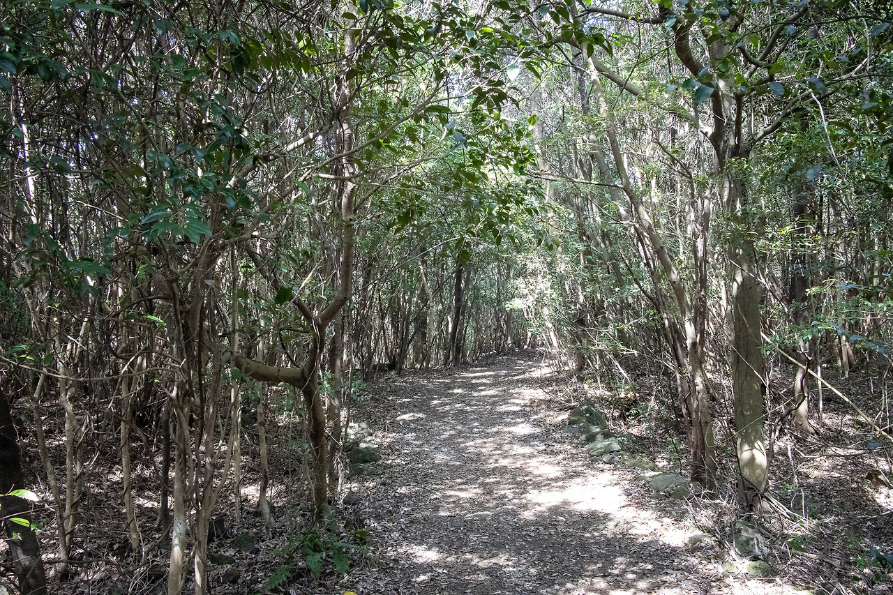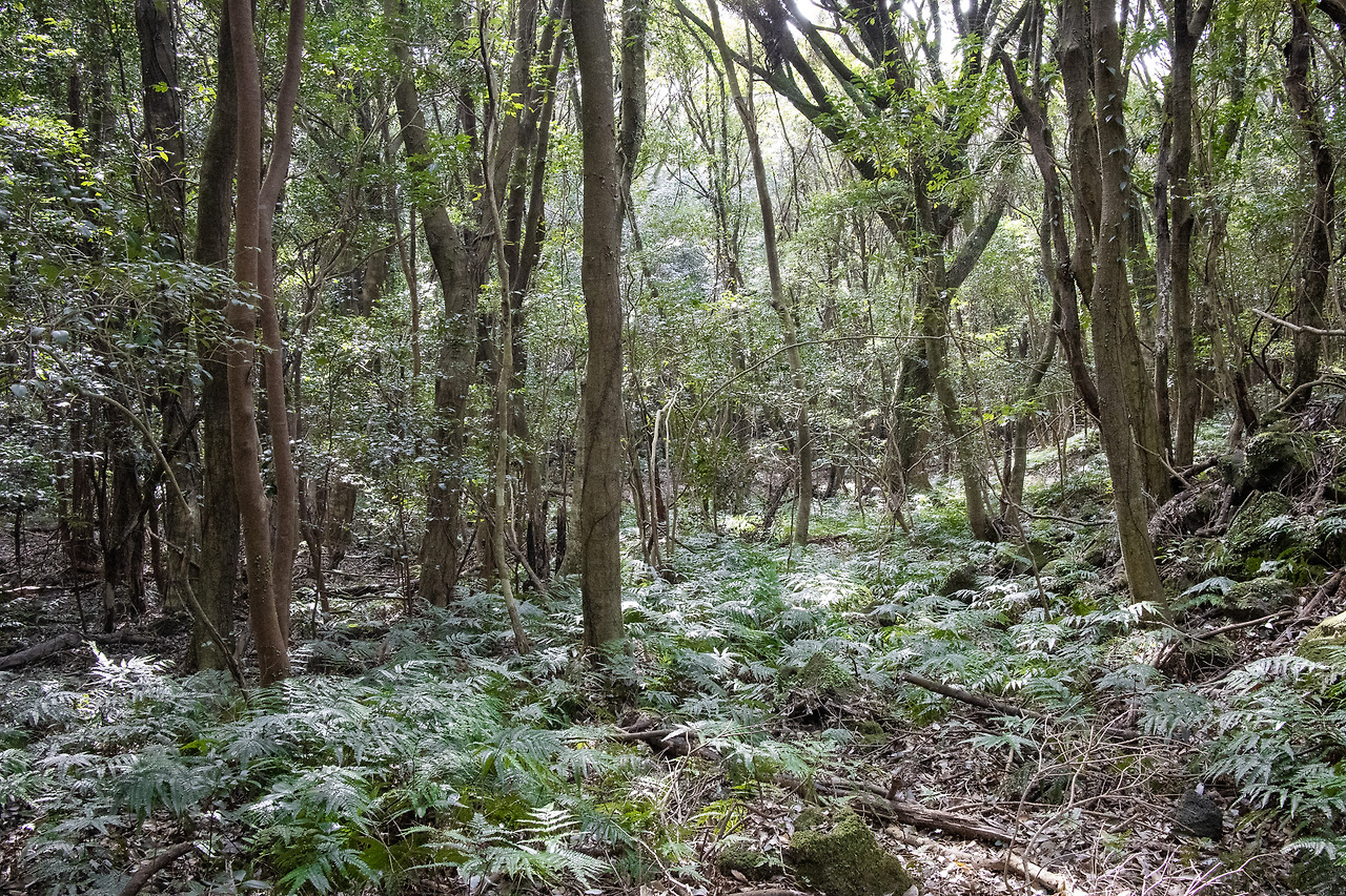 정글에 들어온 것처럼 나무, 덩굴, 양치식물이 섞여 있습니다. 오소록(‘으슥하다’의 제주어) 한 기분이 드는 숲이지만, 중간중간 나뭇잎 사이를 비집고 들어오는 햇빛과 새소리로 숲의 포근함을 느낄 수도 있는 참 이중적인 숲입니다.