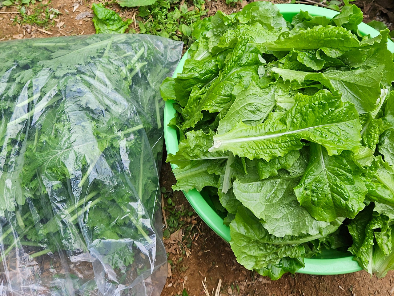 빗물에 다친 청상추와 겨자채가 어느덧 먹기 좋게 자랐습니다. 쌈채소는 가장 신선하고 맛있으면서도 무럭무럭 자라 보는 맛이 좋습니다. 겨자채는 제법 겨자향이 톡 쏘는 게 맛이 잘 들었고 청상추는 밭에서 키웠음에도 아주 부드러워 샐러드로도 먹을 수 있겠습니다. 갓 딴 쌈채소들은 그대로 저녁에 삼겹살을 구워 부모님과 언니네 식구들과 우리 식구들이 잘 싸먹었습니다. 8명이서, 아 조카들은 아직 쌈채소의 맛을 모르니 고기와 밥만 먹었네요. 6명이서 고기 한 점에 서너 장씩 쌈을 싸먹었는데도 아직 넘쳐납니다. 역시 최소 몇 달은 기다려야 하는 작물들과 달리 쌈채소는 가성비가 최고입니다. 거의 2시간을 내리 쌈채소만 땄는데 제법 많아 여러 친지분들과 나눌 생각입니다. 처음엔 하나씩 땄으나 점점 요령이 생겨 한 번에 여러 장을 뜯으니 시간도 단축되고 힘이 덜 들었습니다. 중간중간 개미, 진딧물, 노린재, 이름 모를 갖가지 벌레, 심지어 송충이도 꿈틀꿈틀 기어 다녔지만 유기농이라고 생각하면 뭐 그럭저럭 괜찮습니다. 탈탈 털면 떨어져 나가니까요. 다만 너무 구멍 송송 내지만 않기를 바랄 뿐입니다.