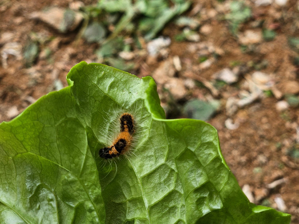 수확한 쌈채소와 상추에 기어다니는 송충이입니다.