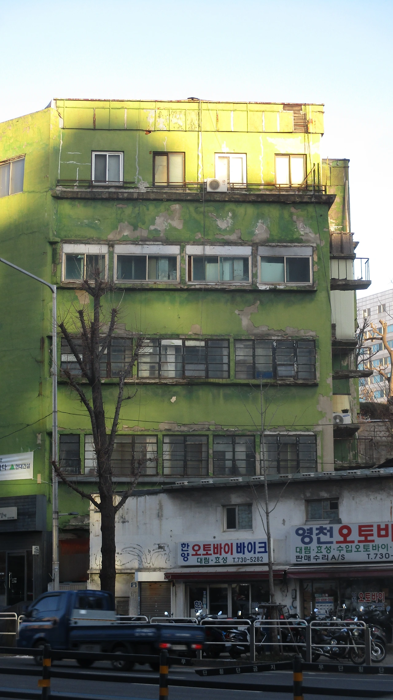녹색 외벽을 한 이 아파트의 이름은 ‘충정아파트’―한국 최초의 아파트이다. 사실 ‘최초’라는 표현을 섣불리 쓰기에는 조금 조심스럽다.엄밀히 말해서 이 아파트가 최초의 아파트인지는 견해가 엇갈린다. 충정아파트보다 앞서 지어진 서울 중구 남산동1가의 ‘미쿠니아파트’를 아파트라고 볼 수 있는지에 대하여 논쟁이 있다. 이 즈음부터는 심오한 학문적 논쟁의 영역이기에 내가 감히 접근할 자격이 없다.