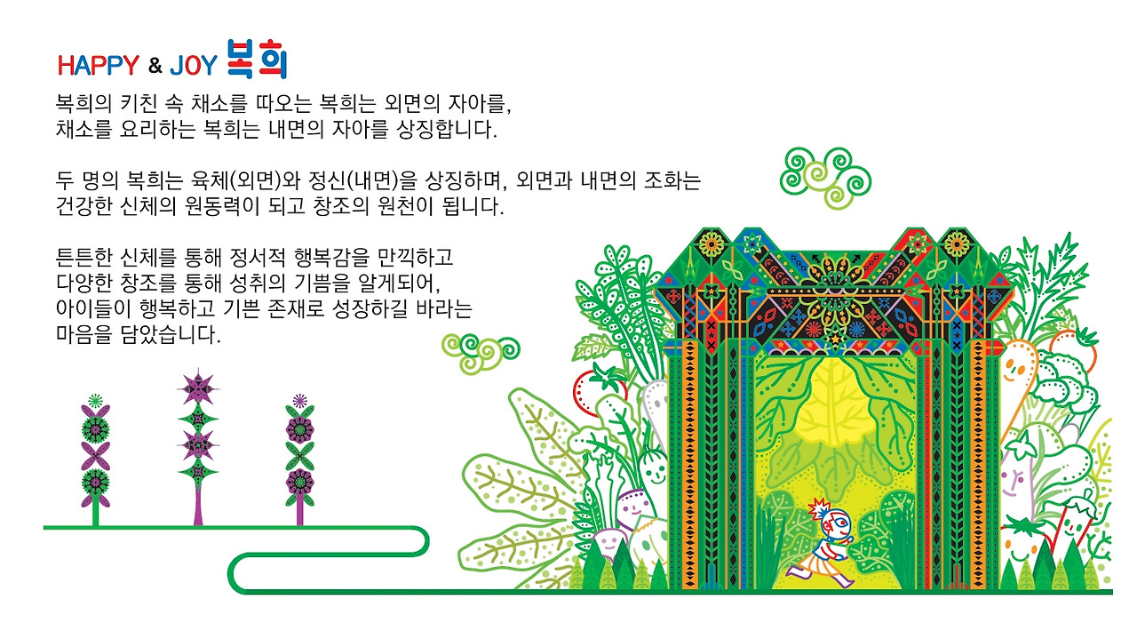 두 명의 복희는 육체와 정신을 상징하며, 외면과 내면의 조화는 건강한 신체 성장의 원동력이 되고 다양한 창조의 원천이 됩니다,