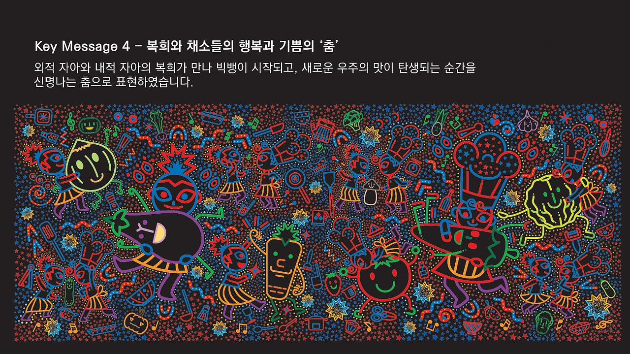집 안에서 새롭게 만들어진 맛송이가 별로 변화하여 집 밖 우주로 퍼져 나가는 모습에서 '모든 창조의 본질은 똑같다'를
