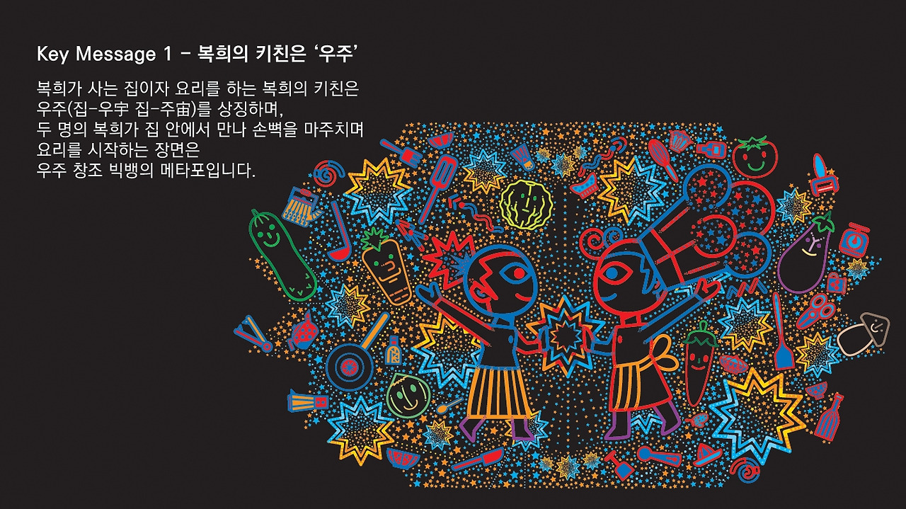 두 명의 복희가 집 안에서 만나 손뼉을 마주치며 요리를 시작하는 장면은 우주 창조 빅뱅의 메타포입니다,