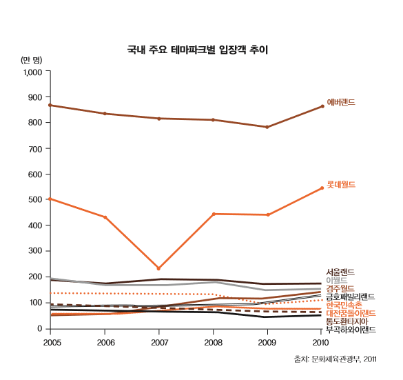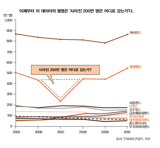 찾으셨나요? 문제의 지점은 바로 2009년 2010년 일제히 상승한 에버랜드와 롯데월드의 입장객 수에 있습니다. 다른 테마파크 들과는 눈에 띄게 다르네요. 지금 보니, 갑작스럽게 상승한 그래프의 기울기까지 같은데요?