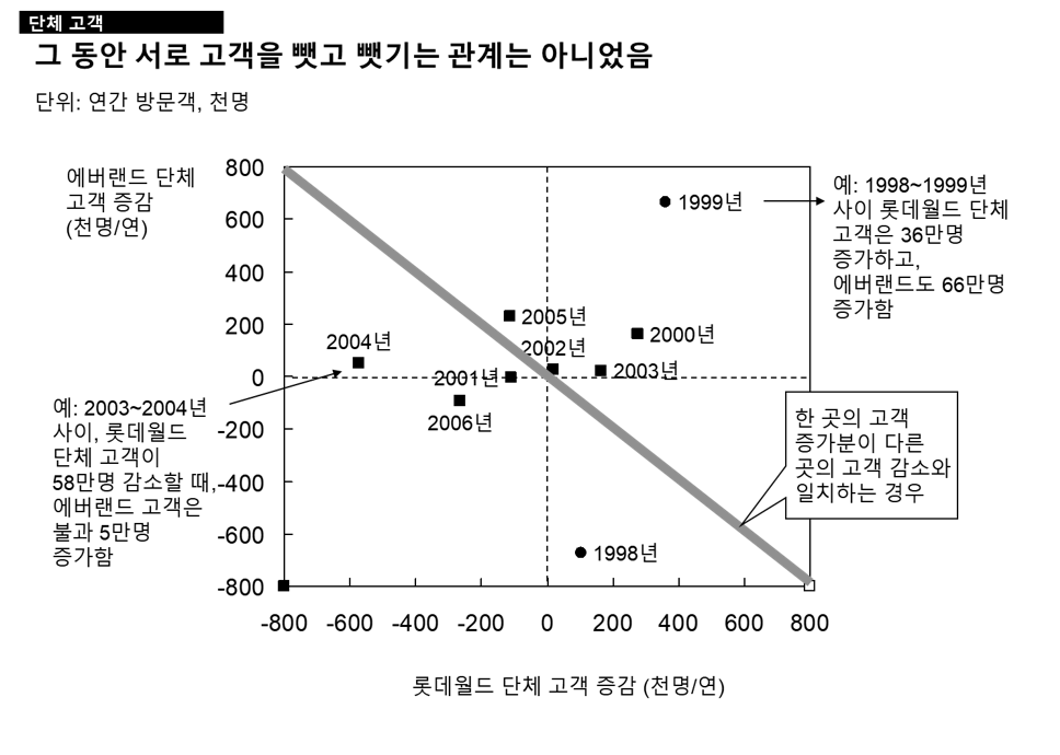 만약 배경 지식을 모르는 경우는, 국내 테마파크 산업은 적어도 2008년 경까지는 주요 테마파크 간 강한 경쟁 관계에 있지 않다고 볼 수 있지만, 2010에는 어떤 요인에 의해 다시 경쟁 관계가 형성되고 있다.