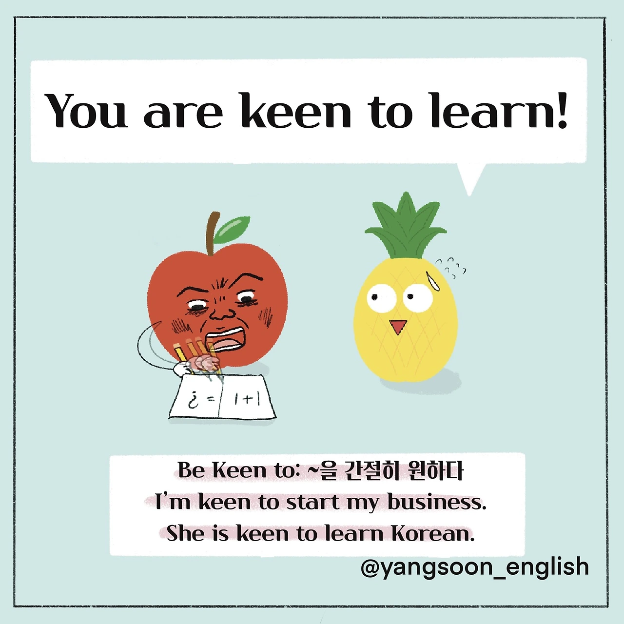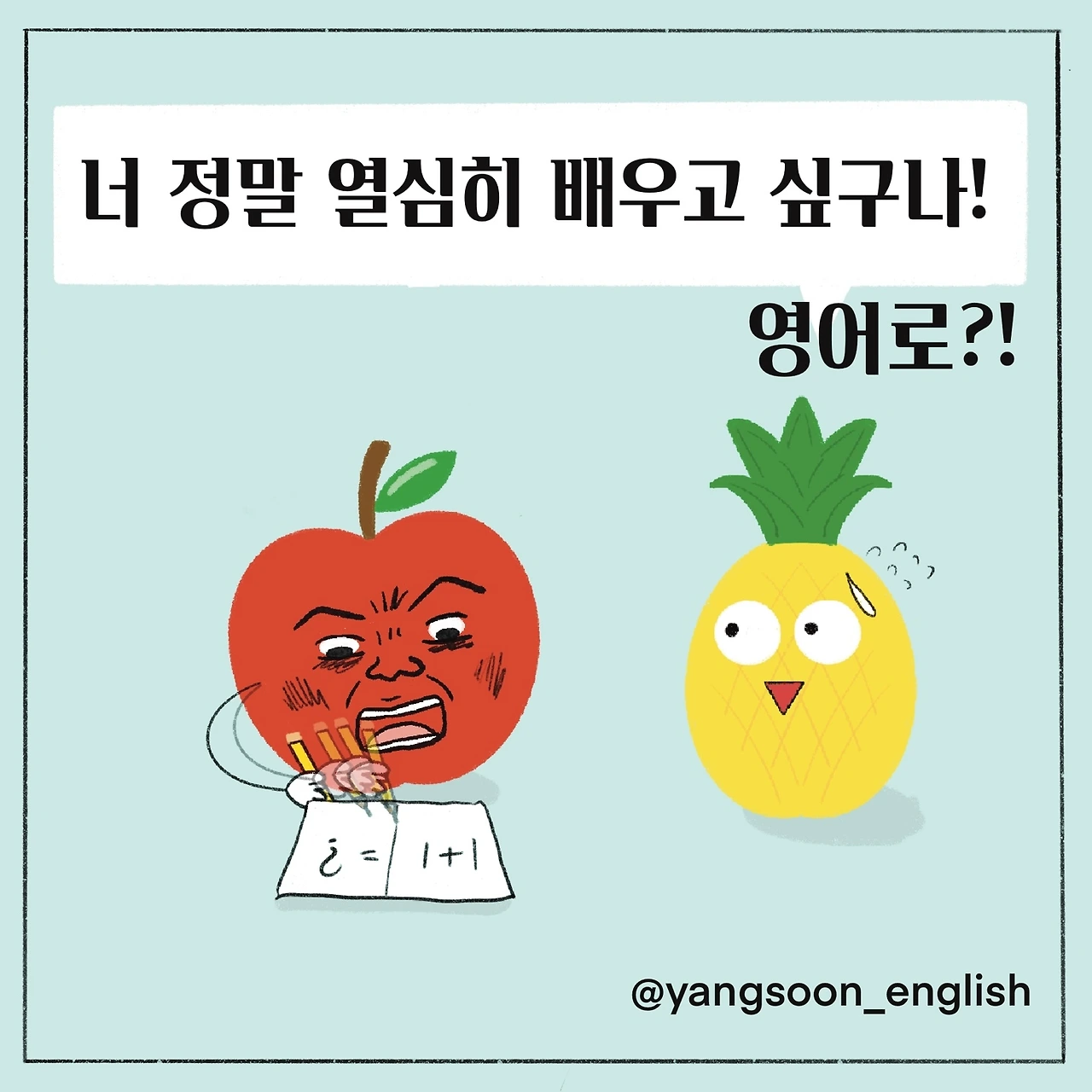 11년 차 대기업 영어 강사. 일상툰을 그리다가 수강생님들께 도움 되시라고 2초 영어만화도 그리기 시작했습니다. 제가 그리는 것들이 소소한 도움과 재미를 드릴 수 있기를 바랍니다.