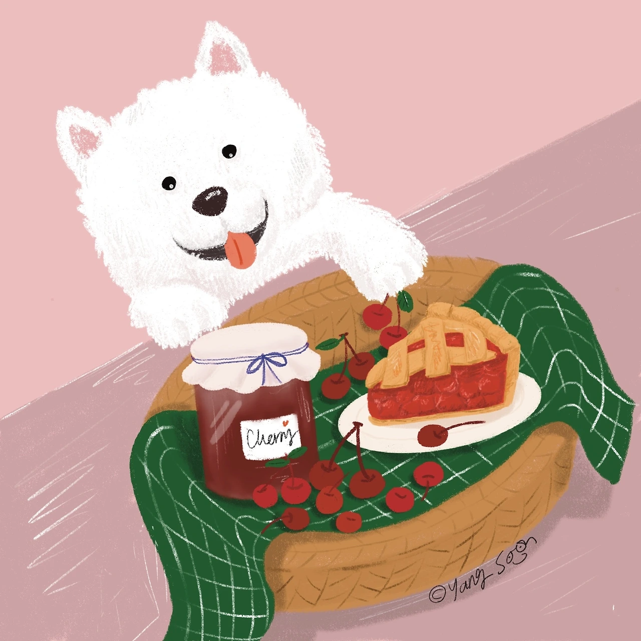 비록 체리파이는 만들어본 적이 없지만 이 그림을 그릴 때만큼은 그림책에 나올법한 '체리파이를 잘 굽는 이웃집 미세스 스미스'에 빙의하여 그려보았다. 체리파이 그리는 것은 참 재밌더라.