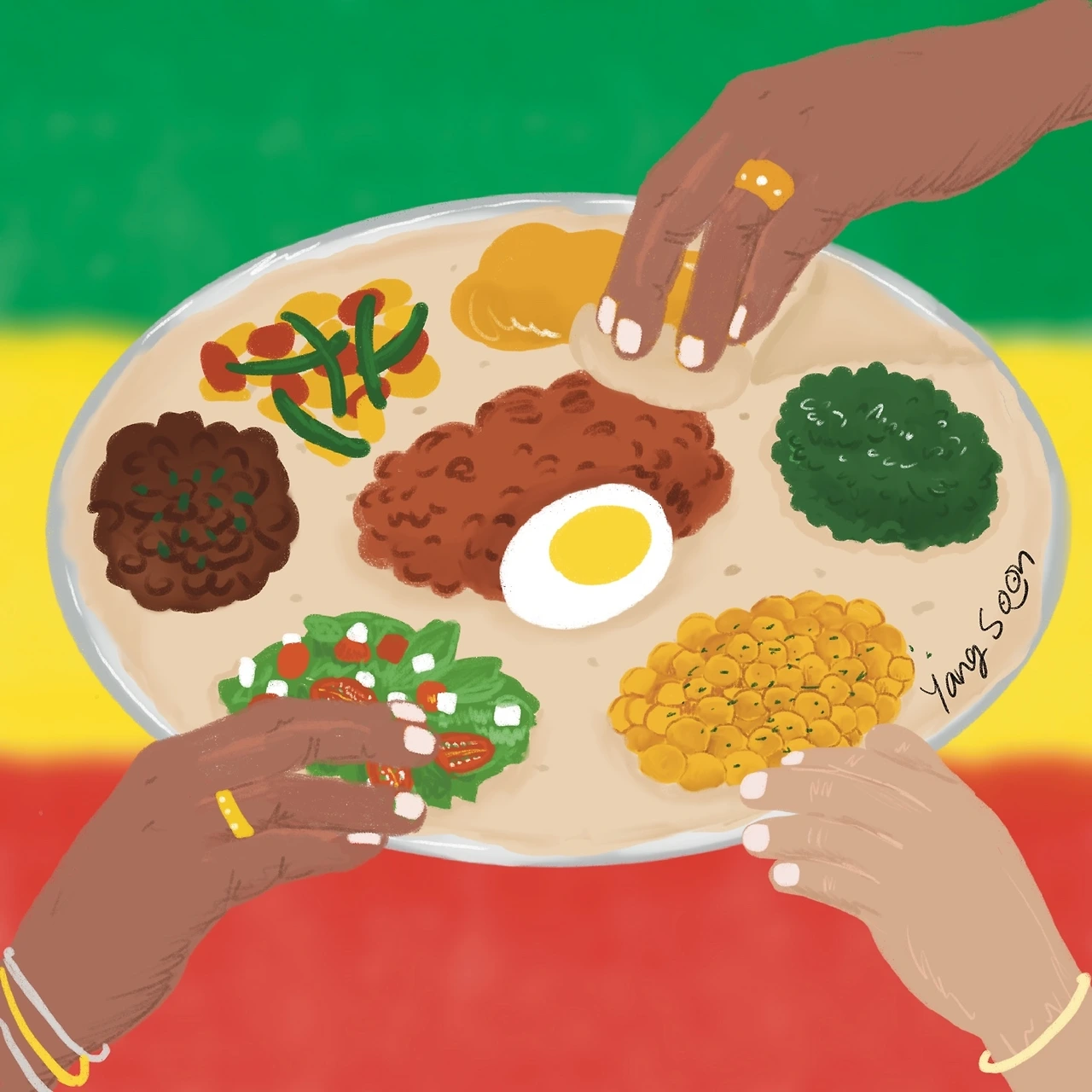 너무 오래전 일이고 스마트폰도 없던 시절이라 그때 기록이 많지는 않다. 하지만 20년도 더 지난 지금까지도 생생하게 기억이 남는 음식이 있다. 그것은 바로 '에티오피안' 음식이다. (사실 일러스트 그리면서 20년 전 기억에 의존하여 구글을 참고하여 그리느라 조금 애는 먹었다.^^;;)