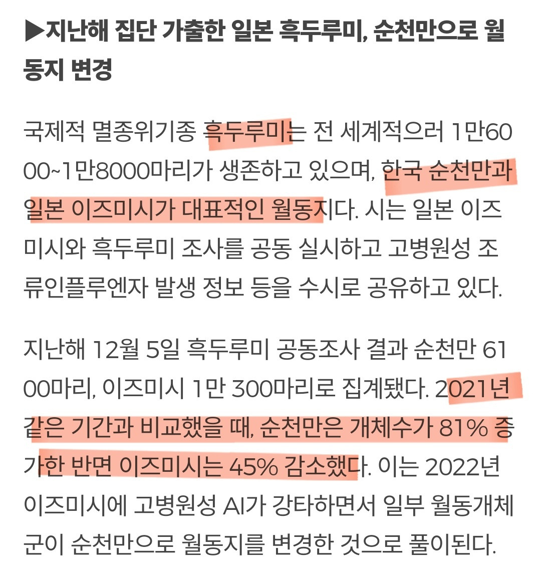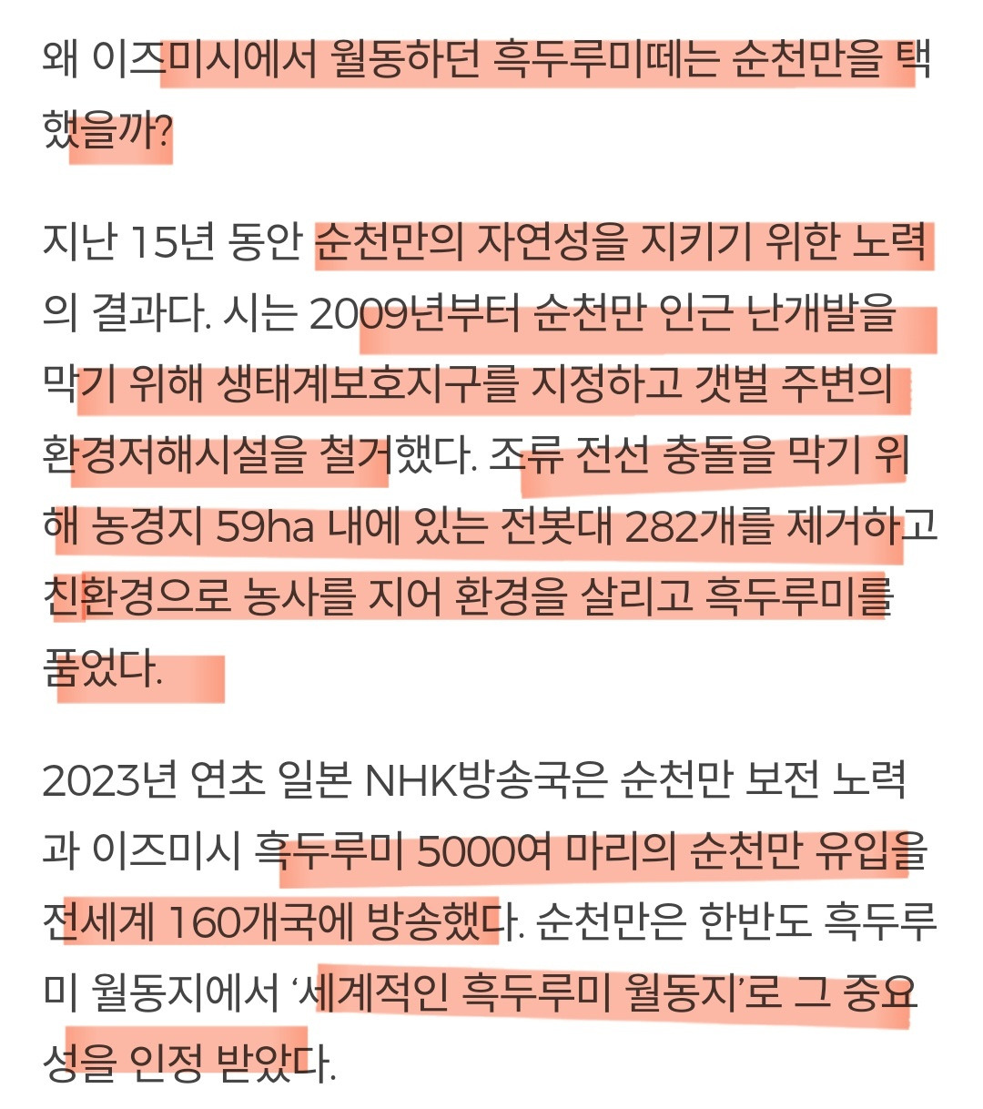 23.1.15일 세계일보 기사에 따르면 순천만에서 월동 중인 흑두루미를 발견 후 야생생물이자 천연기념물로 지정된 귀한 새는 겨울 추위를 피해 천수백 km를 날아오는 철새를 위해 2009년 대대뜰 주변 전봇대 282개를 뽑고 62ha를 보호구역으로 지정했다고 합니다. 도시가 확장하지 못하도록 인근 35만 평을 국가 정원으로 조성하기도 했습니다. 이런 노력 덕분에 해마다 관광객 수도 늘어났다고 합니다.