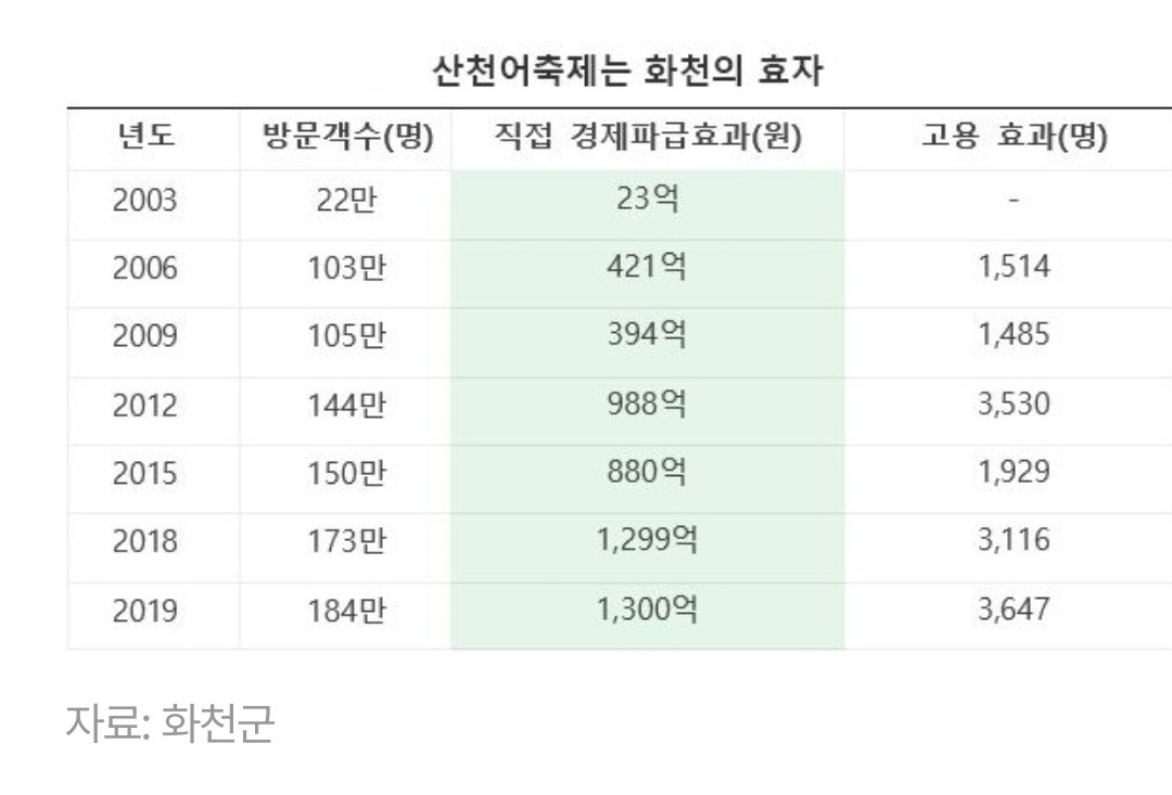 축제는 항상 즐길 거리 놀 거리 볼거리가 많지요. 산천어 축제 기간은 24.1.6~1.28까지이며 연합뉴스에 따르면 14일까지 누적 방문객은 68만 2천 명으로 집계됐다고 했습니다. 화천의 인구는 2만 3천여 명입니다. 실제로 화천군청은 화천 산천어축제의 경제적 파급 효과는 평균 1000억여 원에 달한다고 밝힌 바 있습니다. 화천의 인구와 지금까지 다녀간 방문객 인구는 화천 주민을 먹여 살린다고 해도 과언이 아닐 것 같습니다. 이렇게 경제적 효과가 큰 산천어 축제는 화천군 1년 농사나 다름없는 지역 경제의 효자 노릇을 한다고 합니다.