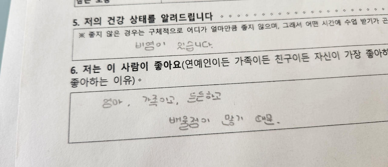 담임선생님께서 아이들이 쓴 자기 자신에 대해서 쓴 일지를 보여주셨습니다.