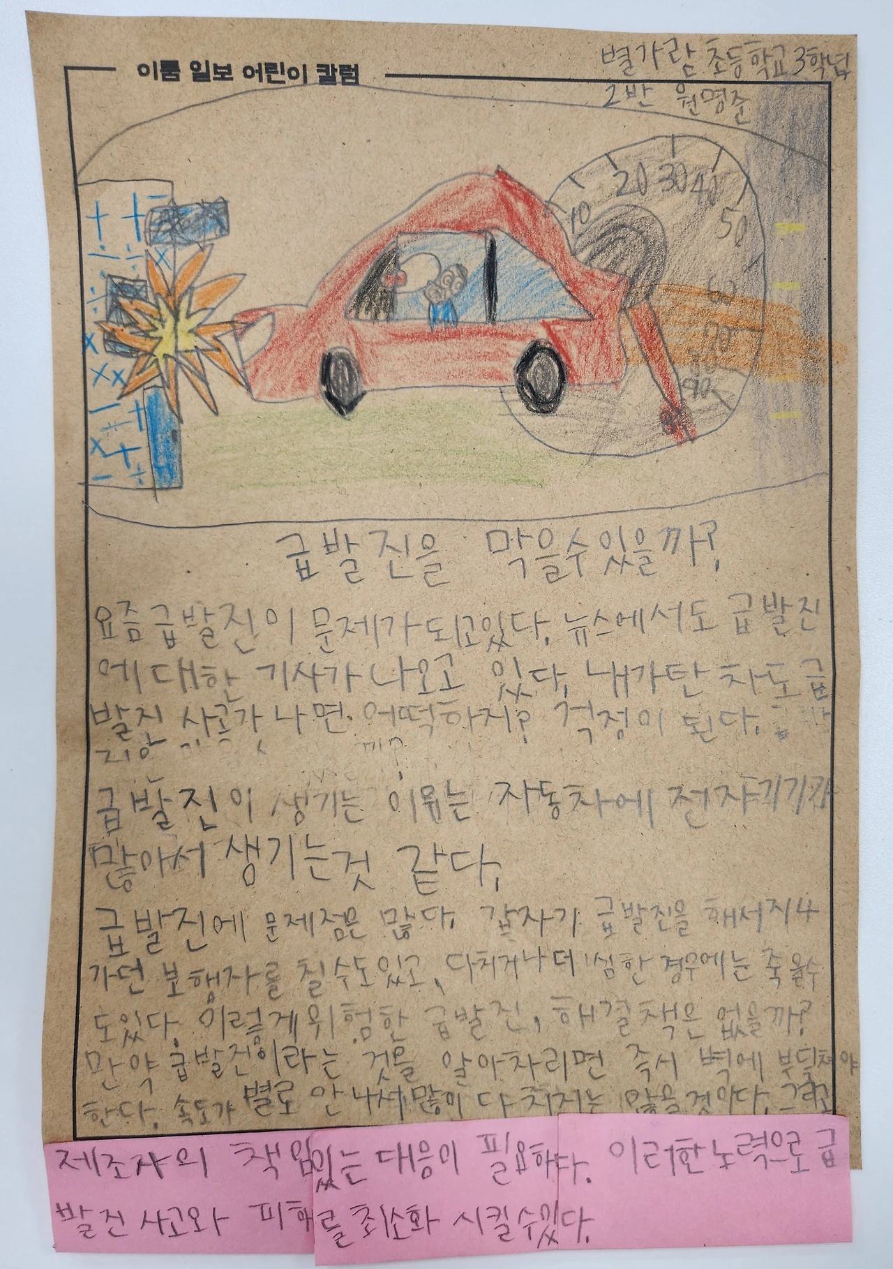 만약 급발진이라는 것을 알아차리면 벽으로 부딪히는 게 인명사고를 줄일 수 있다고 한다. 그리고 제조사의 책임과 적극적인 대응 또한 필요하다고 생각한다.
