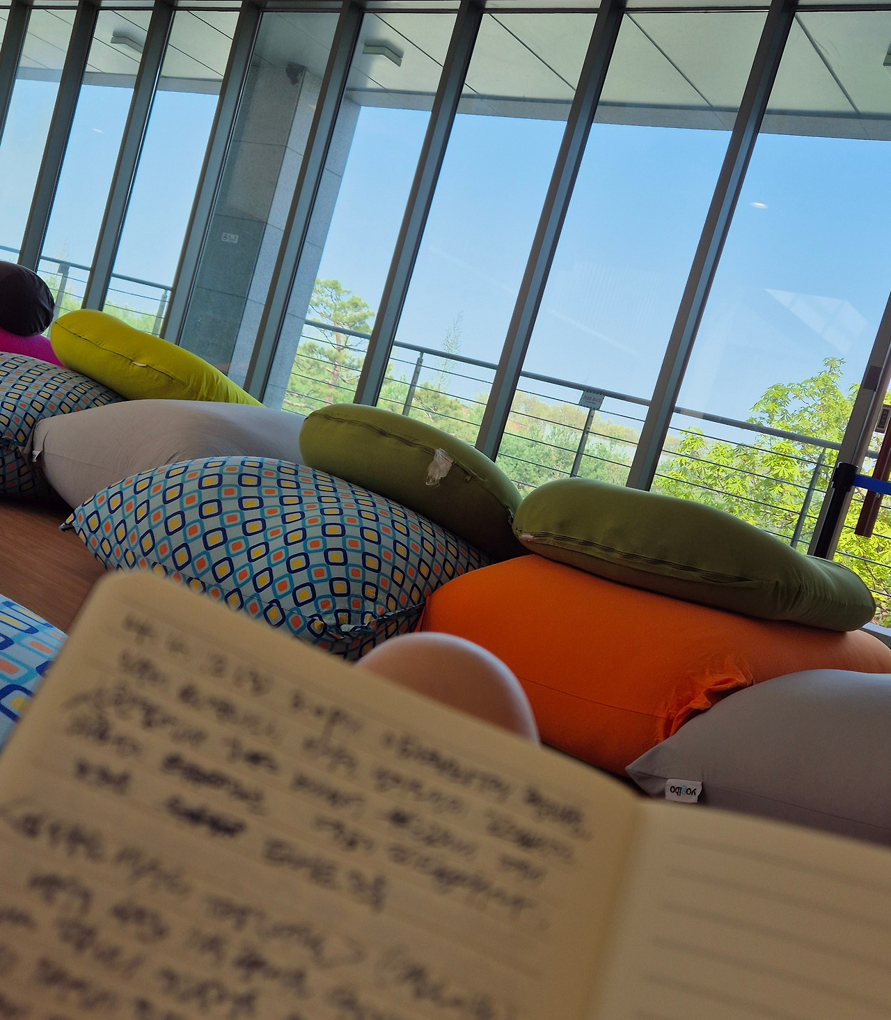 유리창 너머로 파릇파릇한 나무들을 바라보며 빈백 소파에 몸을 기대고 멍하니 감상하고 있자니 이게 신선놀음이구나 싶습니다. 노트를 펴고 떠오르는 글을 써보기도 하고, 찜질방의 핵심인 구운 계란과 식혜도 당연히 먹어주었습니다.