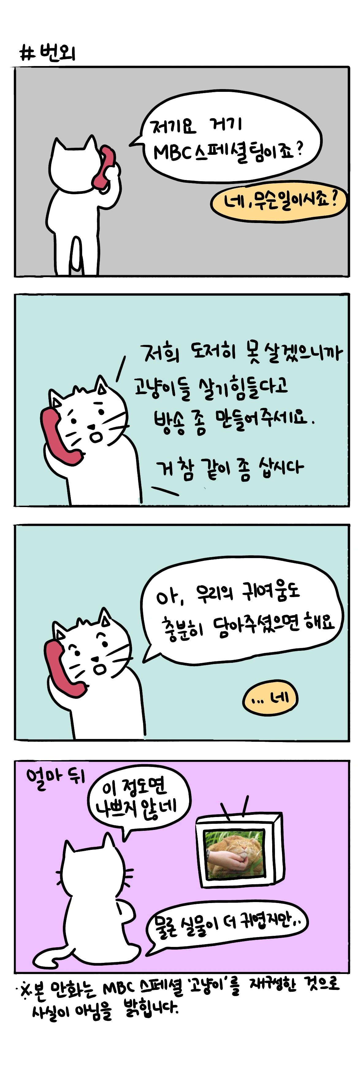 8월 13일 방영된 MBC 스페셜 ‘고냥이’에서는 도시에서 살아가는 길고양이들의 힘든 삶을 다뤘습니다. 길고양이들과 어떻게 공존을 모색해야할지 생각해볼 수 있는 기회였습니다. 도시 속의 자연을 담은 MBC의 도시 X 자연 다큐멘터리는 계속 된다고하니, 기대가 됩니다! (야옹)