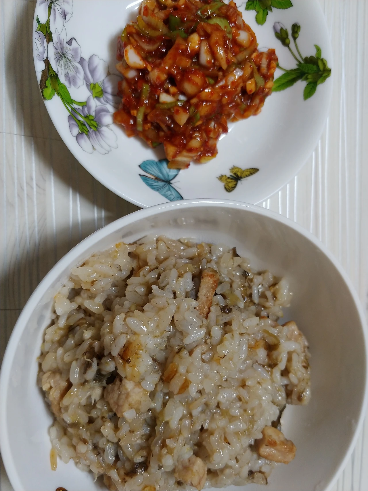 정석대로라면 볶은 가지는 밥이 거의 되어갈 때쯤 넣어야 하는 게 맞지만 전기밥솥은 그게 불가능하니 첨부터 같이 넣을 수밖에 없다. 가지 형태가 조금 뭉그러지는 것 외엔 딱히 문제 될 건 없다. 오히려 나는 이게 좋다.