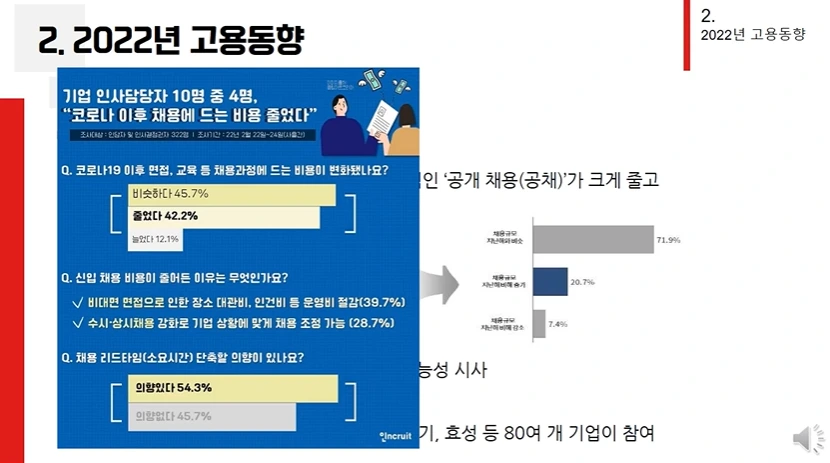 이유) 요즘은 커뮤니케이션과 교육도 비용이다. 따라서, 사람에게 1~2년을 투자할 수 있는 회사는 이제 거의 없기 때문에 실무에 금방 적응하고 해당 분야에 꾸준히 관심을 가져 퍼포먼스를 가져올 수 있는 사람을 선호하게 된 것이다. (비용절감, 높은 퍼포먼스)