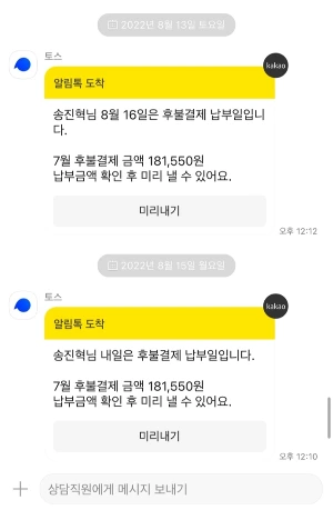 현재 토스는 결제일이라는 명목으로 내게 추심 문자를 보내고 있다. ㅎㅎ 불안한가 토스..? 상환 의사는 있지만, 토스는 이런 경험을 어떻게 설계하고 있을지 기대가 된다. 어떻게 고객 경험을 설계해야 할지 다음 글에서 이러한 경험을 겪어 본 후에 더 설명해보고자 한다.