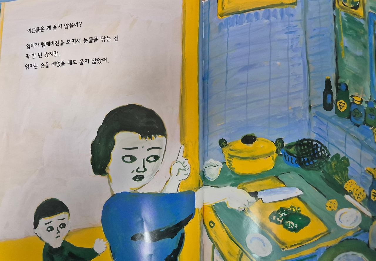 그림책 속 아이는 툭하면 운다. 넘어져서 울고, 부딪혀서 울고, 혼나서 운다. 헤어짐이 아쉬워서 울고, 반가워서 울기도 한다. 갓난아기는 말을 못 하니 불편함을 울음으로 표현할 수밖에 없다. 하지만 대여섯 살 주인공은 도대체 왜 매일매일 울까. 낯선 감정- 아픔, 분함, 슬픔, 기쁨-을 표현할 길이 없어서 눈물을 흘리는 것이 아닐까.