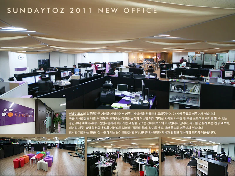 선데이토즈에서 초기에는 다양한 오피스텔을 전전하다 120평 사무실 공간을 4천만원대의 말도 안 되는 저예산으로 당시 우리 입장에서 꽤 쓸만하게 만들었던 경험을 가지고 있다. 당시 에어컨도 없던 불편한 회의실에서 보드 미팅하던 투자자 분들이 가장 좋아하셨기도 하다. 투자한지 꽤 되었지만 이제 드디어 사람 많이 뽑고 돈 쓴다고...
