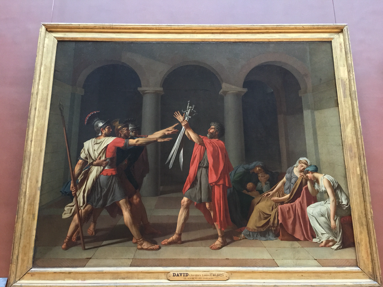 자크 루이 다비드가 살롱전에서 입상한 영광의 작품이지만 동시에 프랑스 인민들에게 애국심을 고취하고 가부장적 국가주의 인식을 심어준 회화의 대표작이 첫 번째 작품인 '호라티우스 형제의 맹세'다. 기원전 7세기 라틴족 도시국가 연합체의 패권을 놓고 다투던 로마와 알바 롱가는 전쟁을 하는데, 시민들을 전투에 내모는 대신 각 가문별 대표 셋이 나와 결투를 하는 것으로 승부를 내기로 한다. 이에 로마에서는 호라티우스 가문의 삼형제가 대표로 나가게 되었고, 알바 롱가에서는 큐라티우스 가문의 삼형제가 대표로 나서게 되었다. 비극의 씨앗은 호라티우스 가문의 딸이 큐라티우스 가문의 아들과 약혼한 사이라는데서 비롯된다. 그림을 보면 호라티우스 가문 삼형제는 로마식 경례를 하며 공화국에 대한 충성을 맹세하고 있고, 그 셋은 서로 굳세게 끌어안고 형제애를 드러내고 있다. 가운데에 있는 가부장인 호라티우스 가문의 아버지는 칼 세자루를 주며 아들들의 애국심과 명예를 칭송하고 있다. 이와 반대로 오른편에서는 어머니와 며느리와 딸이 죽을 운명에 나갈 아들과 남편과 오빠 혹은 장래의 남편이 죽을지도 모를 일에 비탄에 빠져있다.