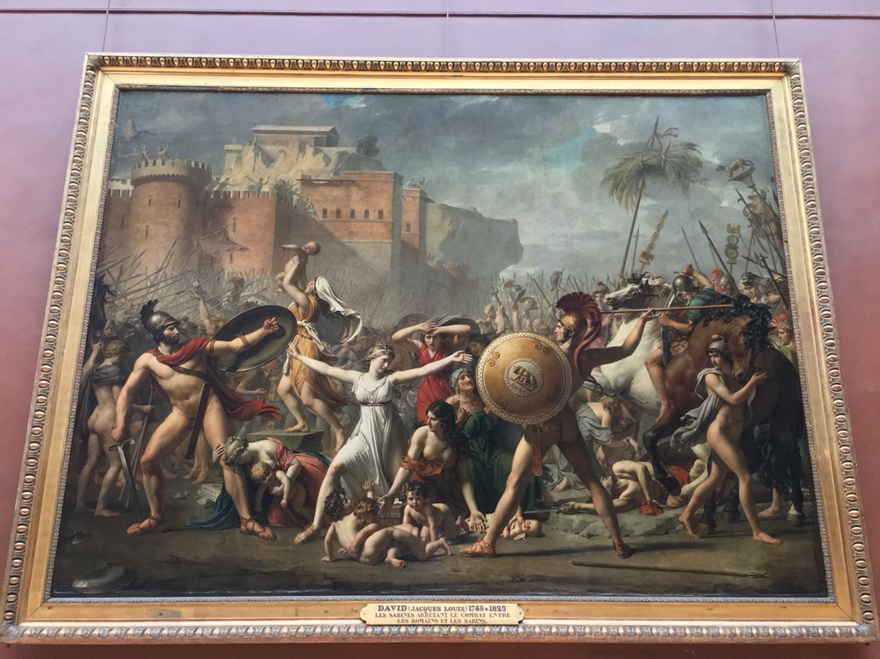 이러한 자크 루이 다비드의 프로파간다는 두 번째 작품인 '사비니 여인의 중재'에서 더 극명하게 드러난다. 로물루스 건국 초기 양치기와 사냥꾼들의 조악한 집단에 불과한 로마는 여성이 없어 가족을 꾸릴 수가 없는 상황이었다. 이에 로물루스는 이웃 사비니족을 모두 초대한 후, 그가 신호를 하면 사비니족 여인들을 강간하도록 시킨다. 딸 혹은 동생을 로마에게 기습적으로 빼앗긴 사비니족은 로마에 전쟁을 선포하고, 둘은 싸우는데, 남편 혹은 아버지나 오빠 둘 중 하나는 죽어야만 하는 운명에 처한 사비니족 여인들은 전쟁터 한복판에서 이 전쟁을 중재한다. 이 역시 국가주의 프로파간다와 국가의 목적을 위해 기꺼이 희생을 바치는 사람들의 모습이 드러나있다. 이 작품에서 문제는 역시 사람을 국가의 도구로 간주하는 생각이다.