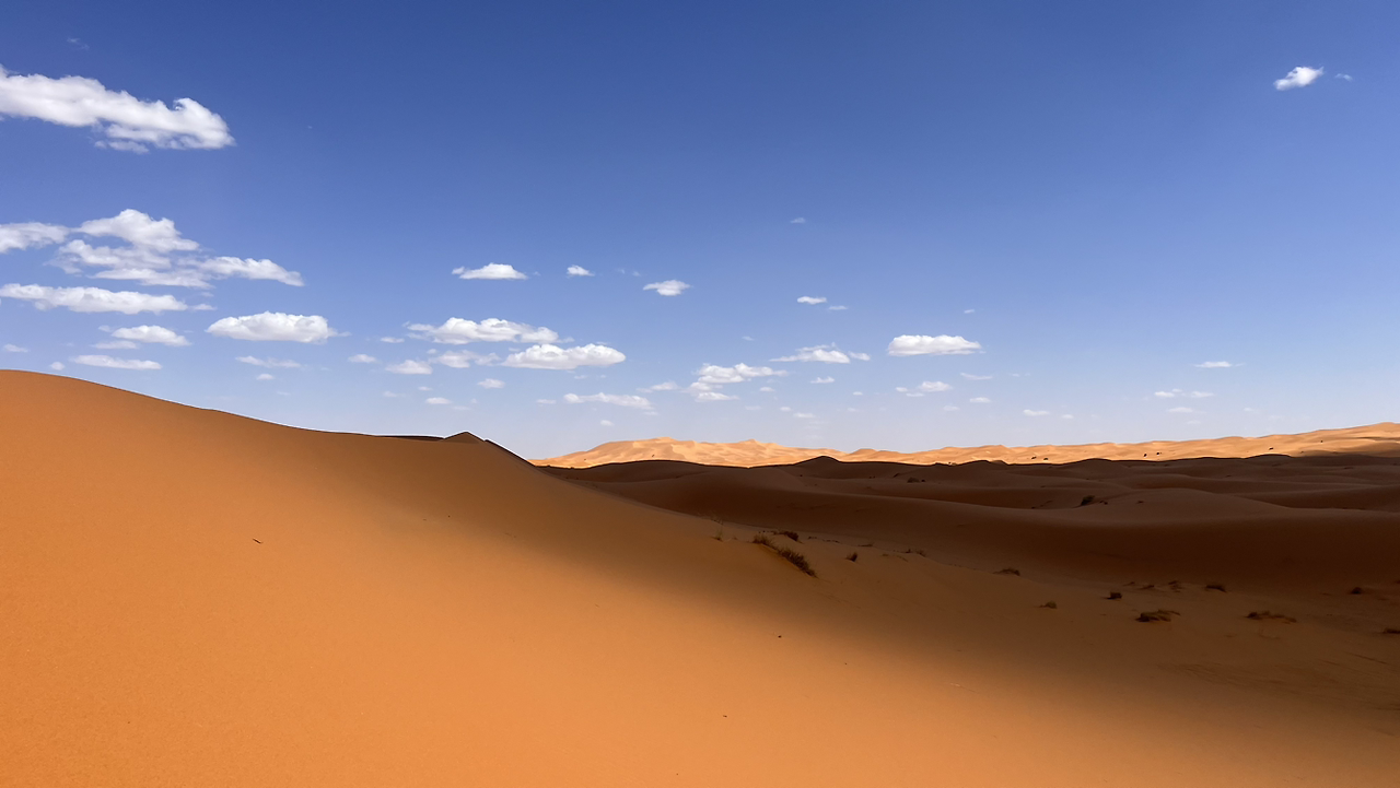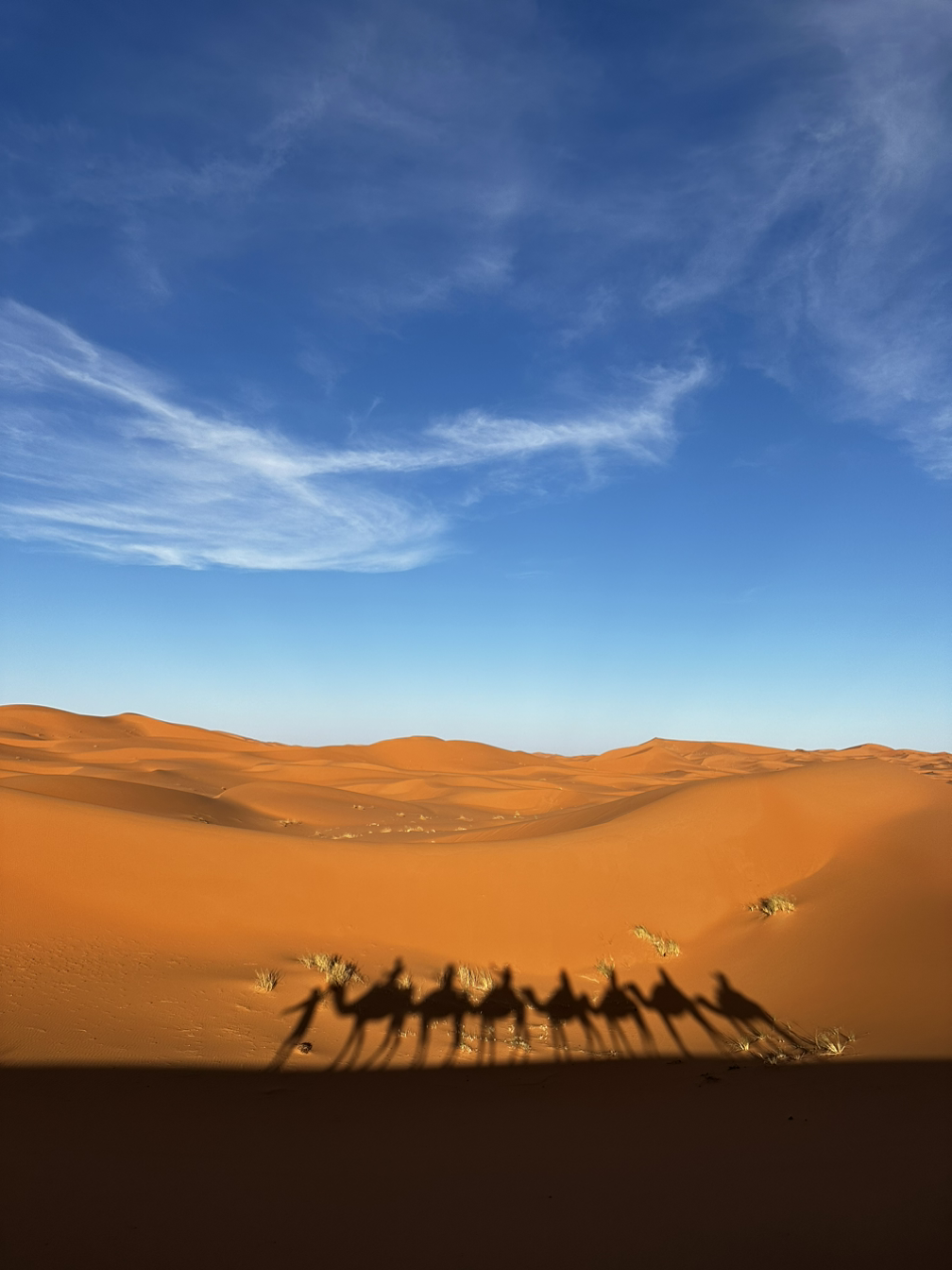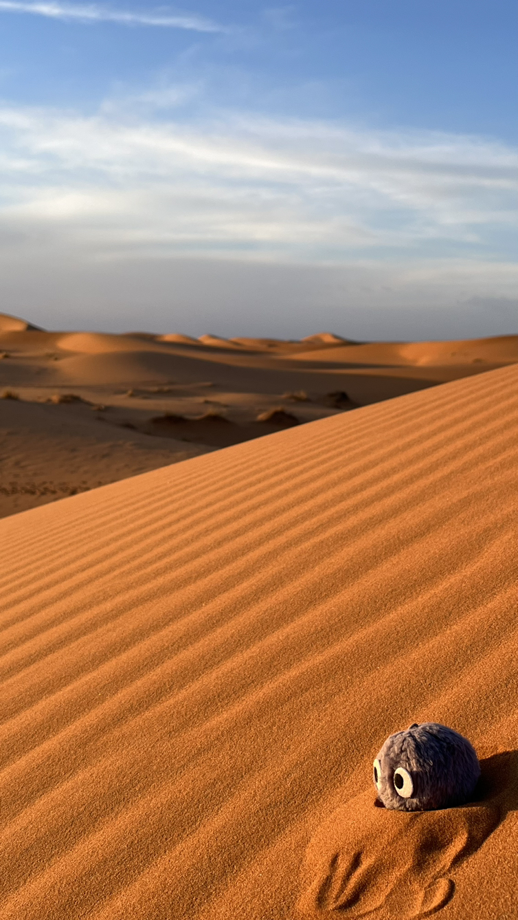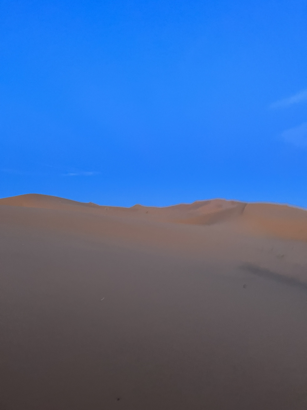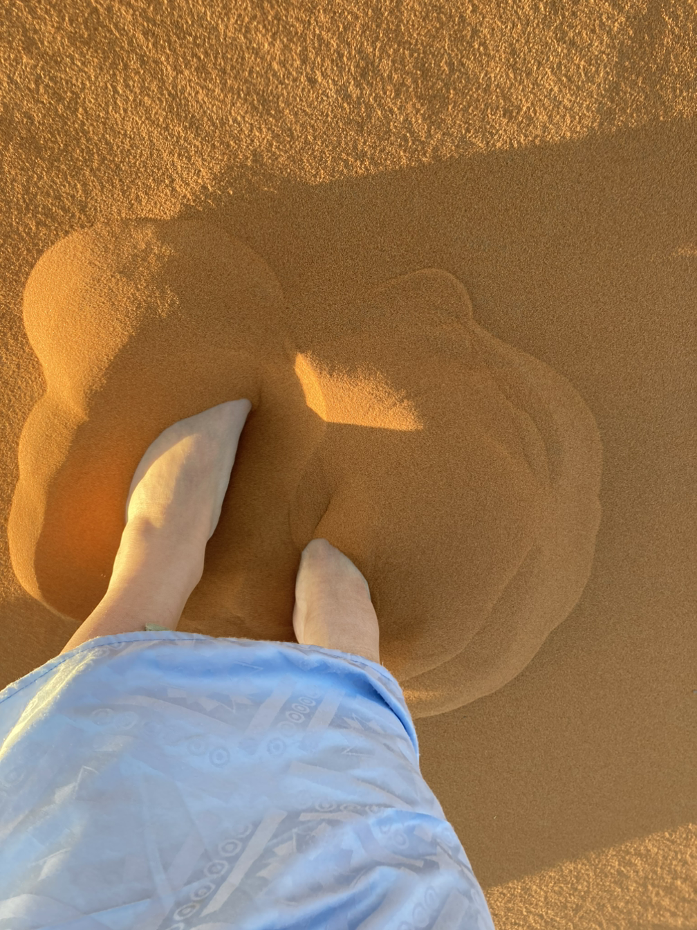 "낙타 마사지 끝. 낙타 힘들어."라는 능숙한 한국어를 선보인 한 베르베르인이 사막 선셋 포인트 앞에서 모든 낙타를 멈춰 세웠다. 어트랙션마냥 쉽지 않았던 첫 번째 낙타를 잠재우고 일몰에 반사된 황금빛 모래에 발을 내디뎠다. 푹 소리와 함께 두 발이 모래 언덕에 파묻혔다. 운동화를 신고 있었던 탓에 틈새로 가는 모래 입자가 스며들어오는 것이 느껴지자 재빠르게 양말까지 벗어던졌다. 한 걸음걸음을 걸을 때마다 모래가 밟힌다는 느낌보다는 주르륵 힘없이 주변으로 흘러내린다는 느낌이었는데, 이 텍스처가 영원히 남는 물자국 같아 보이기도 했다. 보고 느끼는 모든게 새로운 것 투성이었다.